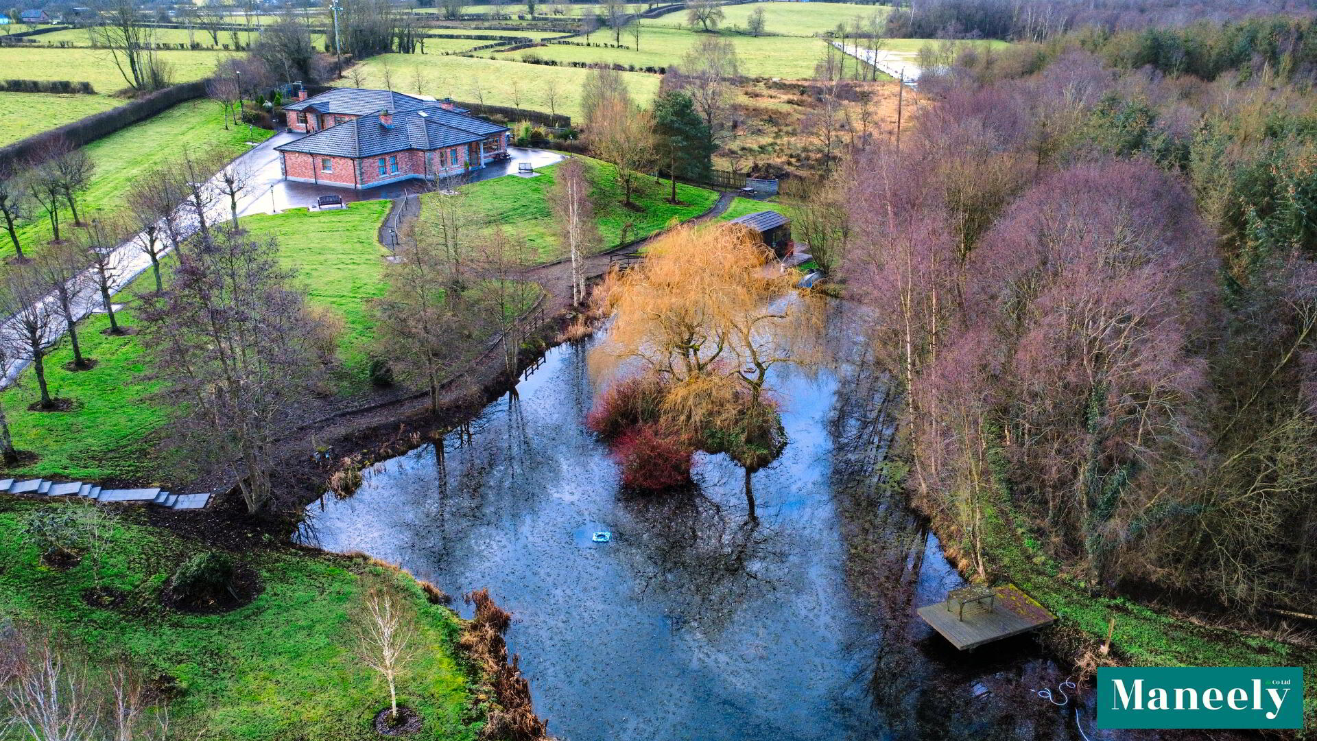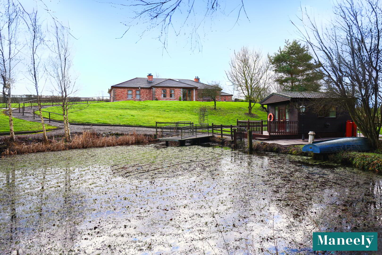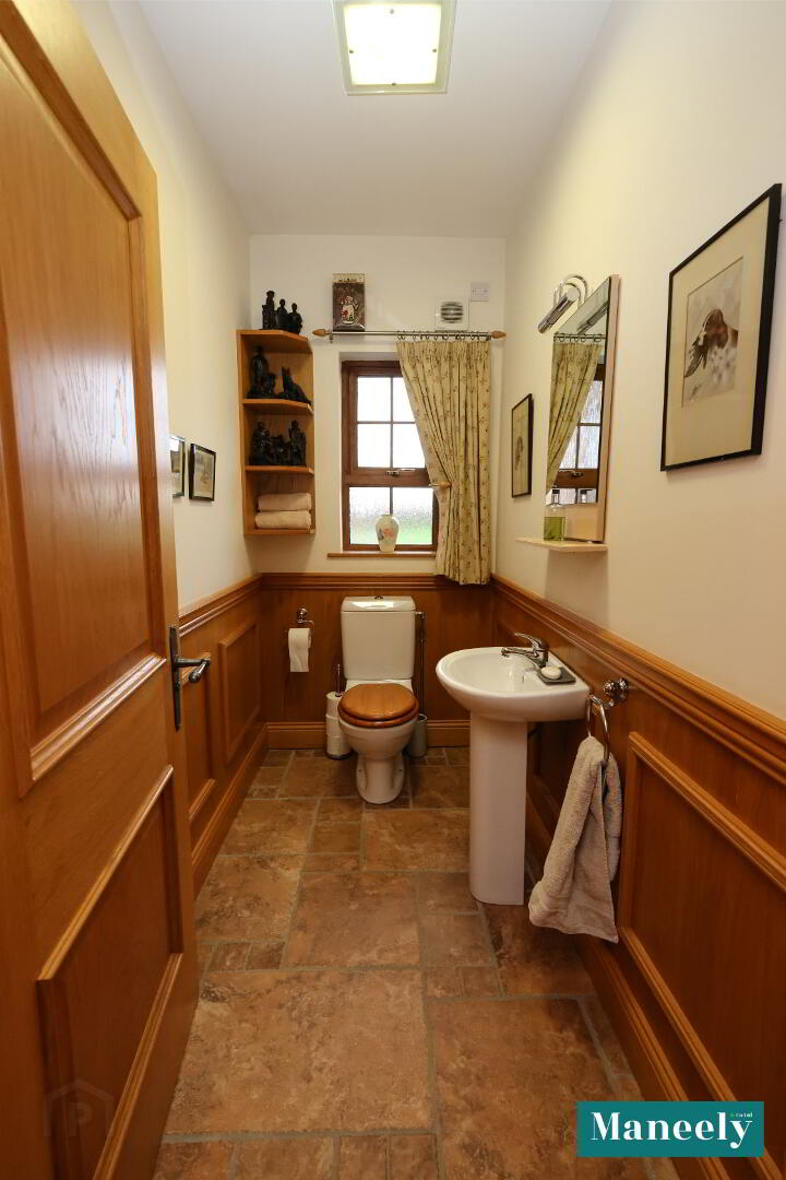 Set on an exceptional 6.5-acre private estate, this impressive residence, built in 2006, offers luxury living with outstanding lifestyle features. The main dwelling boasts elegant proportions, high standard of finish and attractive features throughout. Highlights include a grand living room, a stunning open-plan kitchen, living and dining space with oak units, granite worktops and exposed beams, and a superb master suite complete with dressing room, en suite, jacuzzi bath and private sauna. Two further bedrooms and a beautifully appointed family bathroom complete the home. A fully self-contained two bedroom, two bathroom annex provides excellent accommodation for guests or extended family, while additional amenities include a garage, external utility and WC, and a charming fishing lodge overlooking the private lake. The grounds are truly remarkable, featuring landscaped gardens, a lake with fishing piers and island, woodland walk, field, polytunnel and vegetable patch. Gated access, sweeping driveway and backup generator complete this rare and exceptional offering. Situated at 203 Ballynakilly Road, Coalisland, the property enjoys a peaceful yet accessible rural setting, offering exceptional privacy while remaining convenient to local amenities and road links. Junction 14 of the M1 Motorway is just one minute away which offers excellent access to Belfast, Omagh, Enniskillen and other large towns via the A4 & A5 main roads. Homes of this scale, quality and setting, combined with such extensive grounds and lifestyle features, are exceptionally rare, and opportunities to acquire a residence of this calibre come to the market only on the most infrequent occasions.