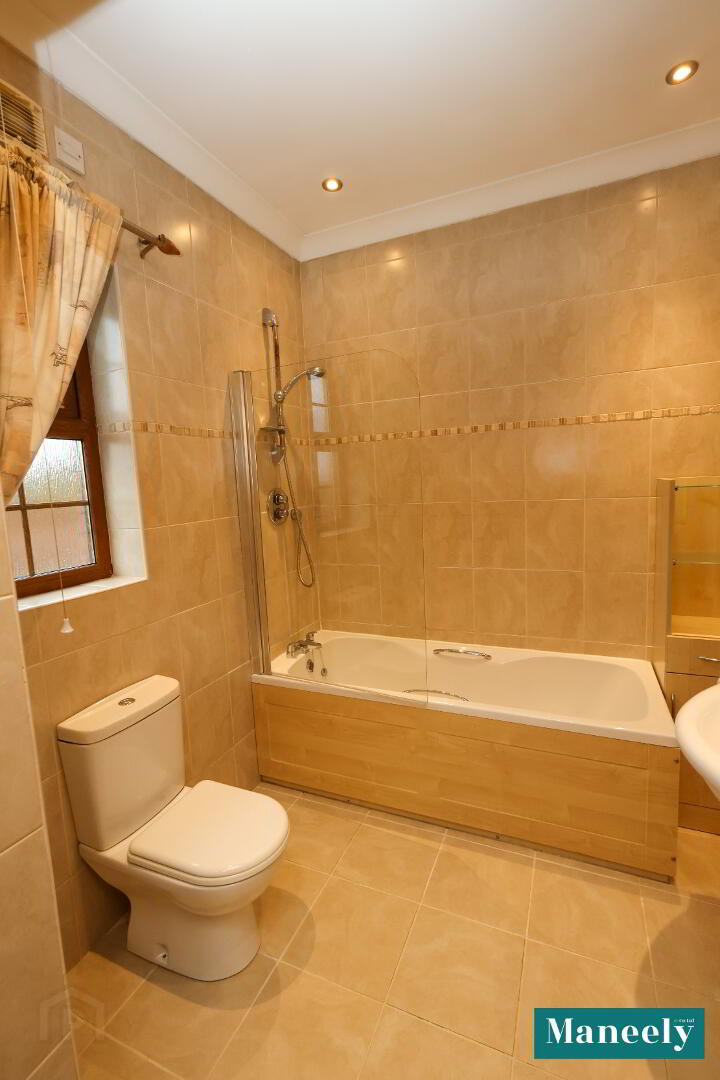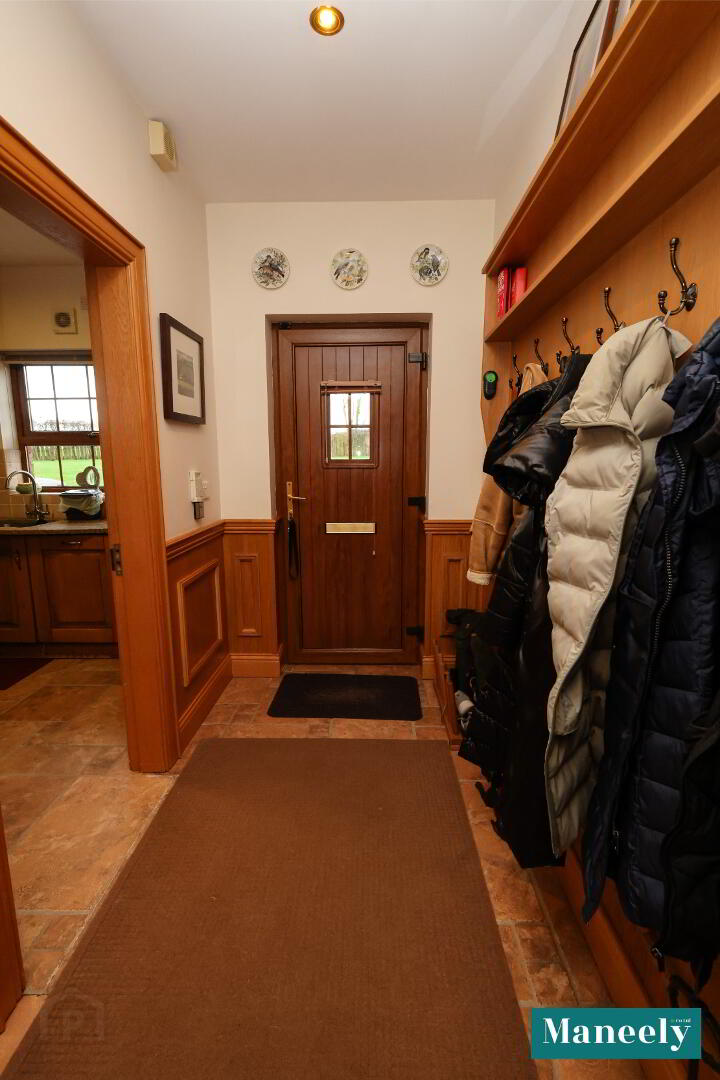 PVC front door with side glazing, recessed spot lighting, wooden flooring, stained-glass light well, decorative cornicing, hot press and two storage cupboards.