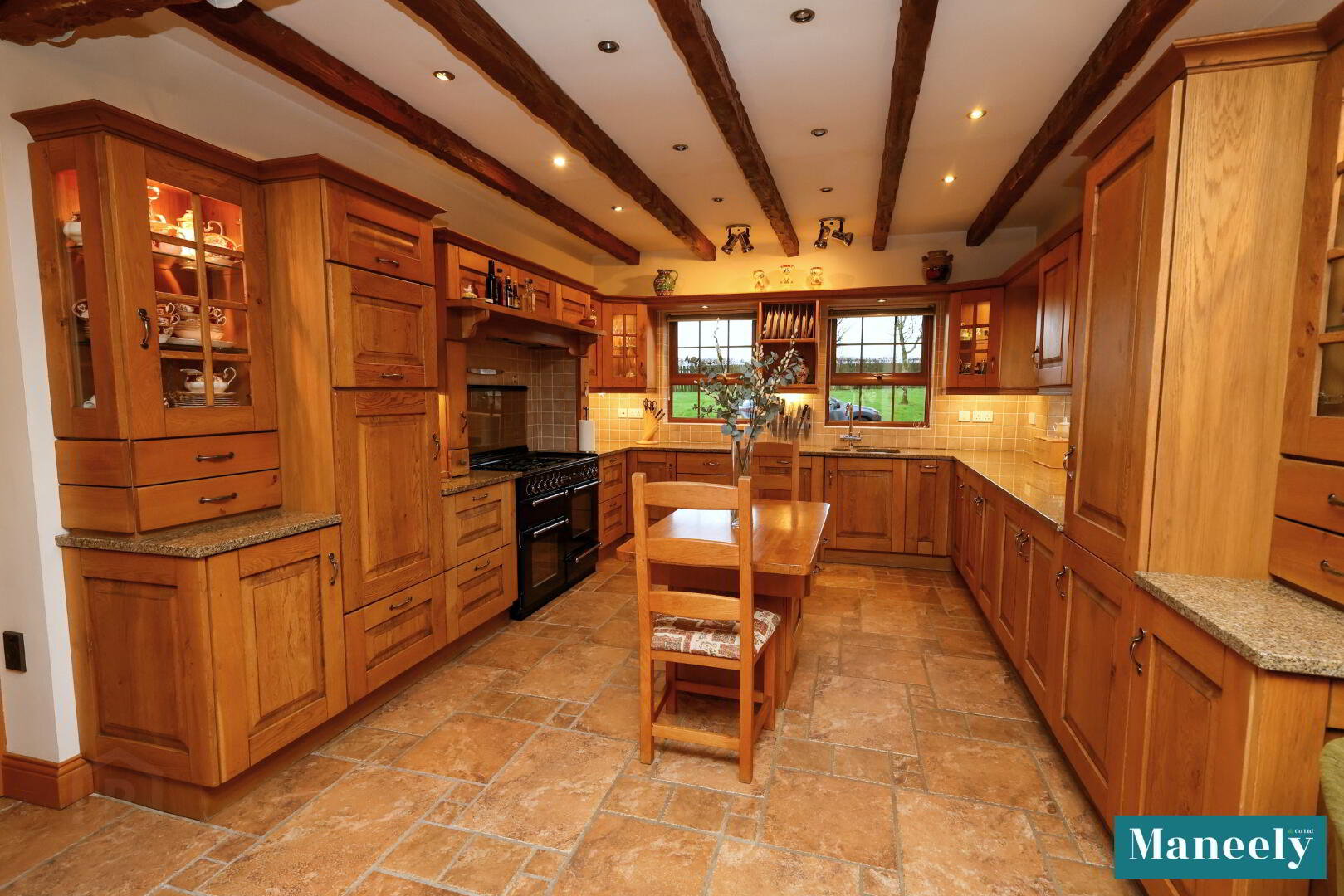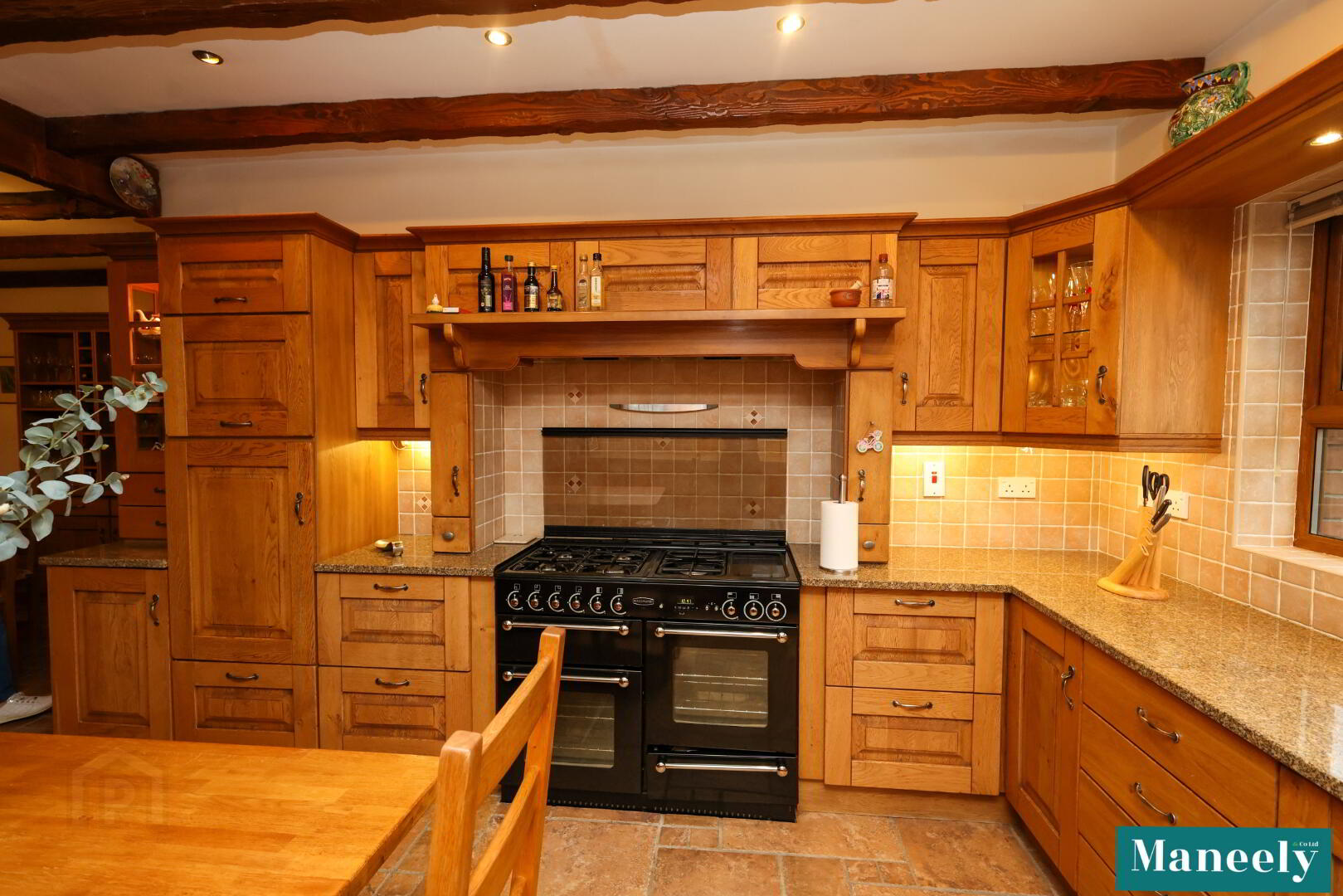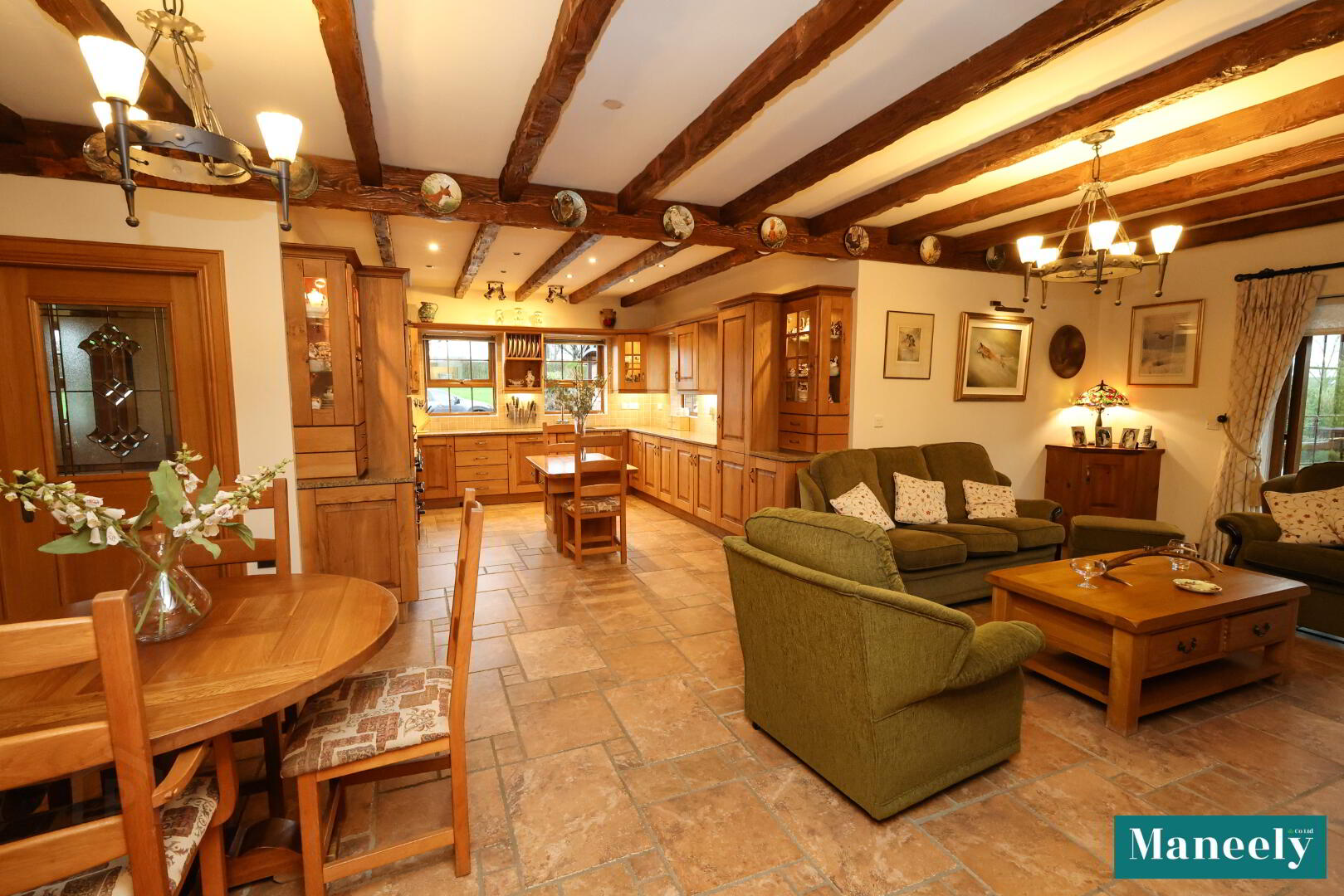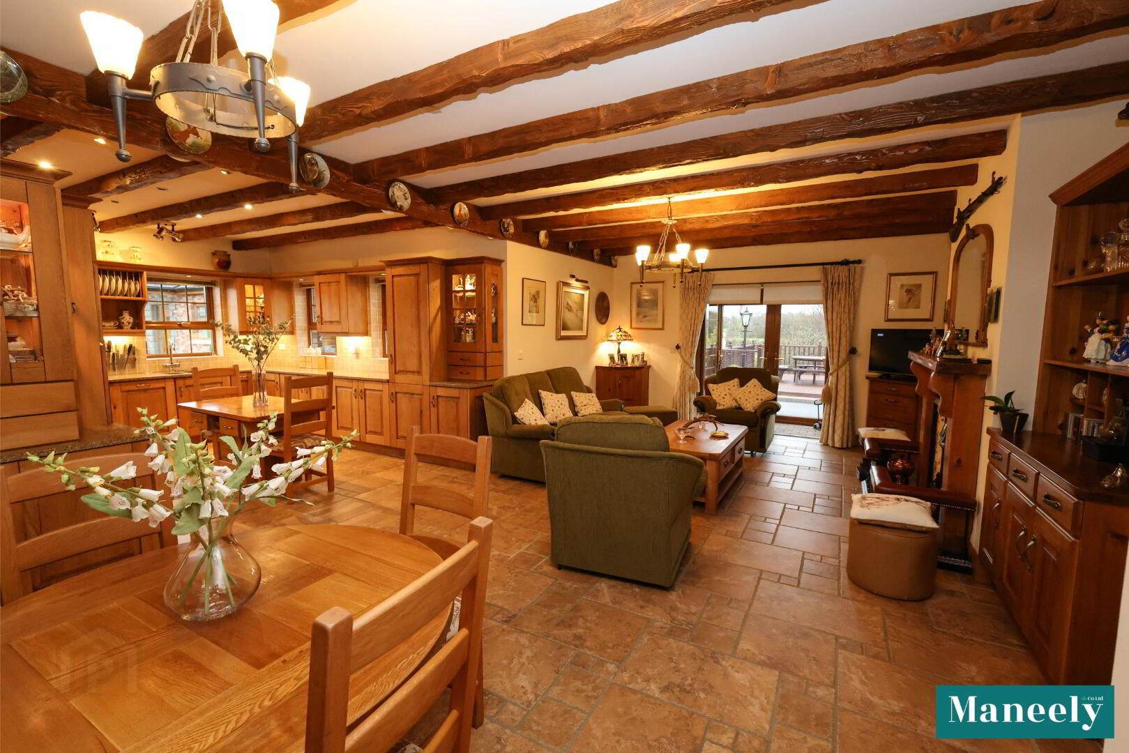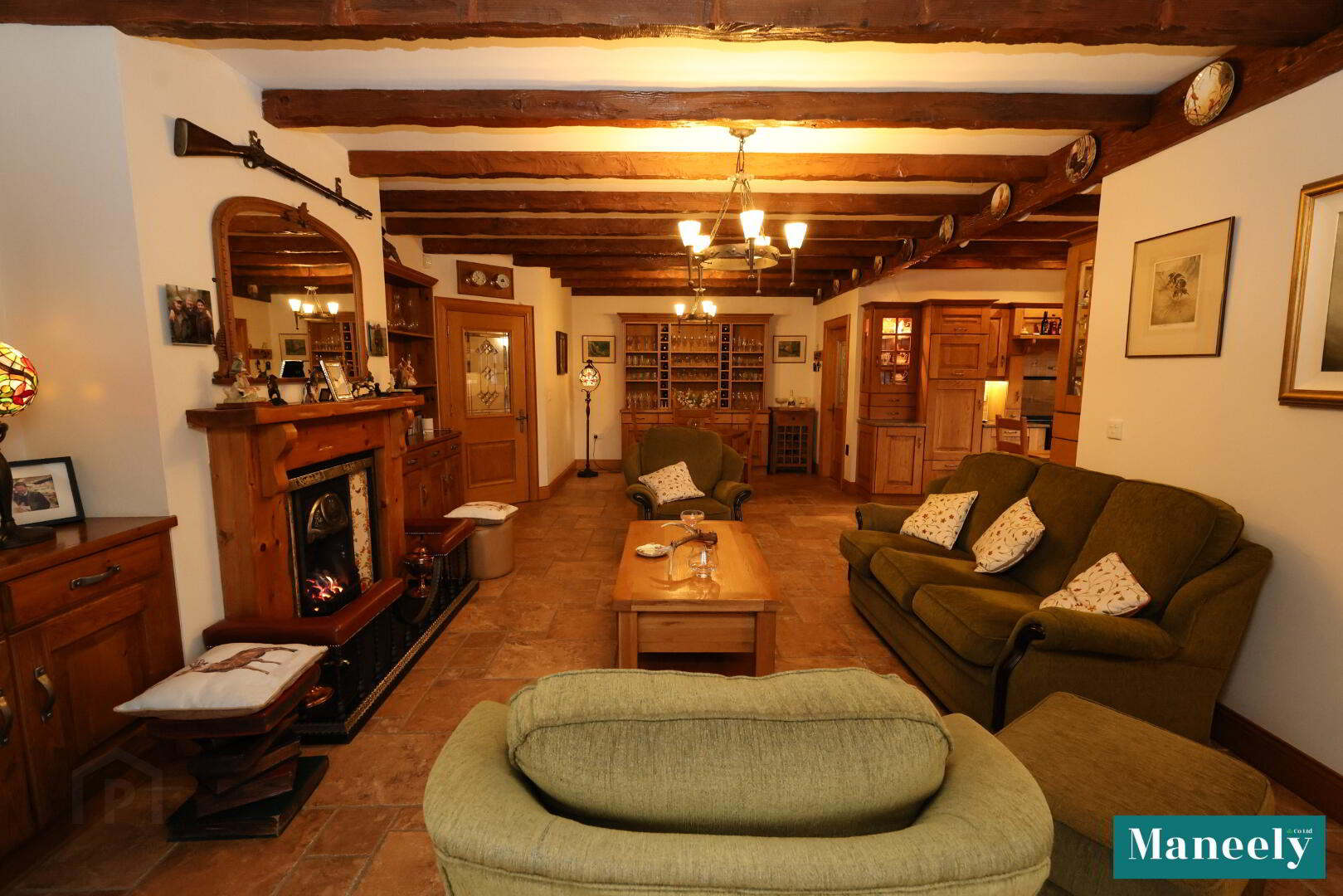 Bespoke solid oak kitchen with granite worktops, extensive high and low-level units, glazed display cabinets, 1.5 bowl stainless steel sink, pelmet and under-counter lighting, ceiling spotlights and exposed wooden ceiling beams. Integrated fridge/freezer, under-counter fridge, space for cooker and a solid wooden island. Dining area with space for a large dining table and built-in display and storage unit. Living area with feature open gas fire with wooden mantle and granite hearth, built-in storage units and tiled flooring. Rear porch with tri-aspect windows and French doors.