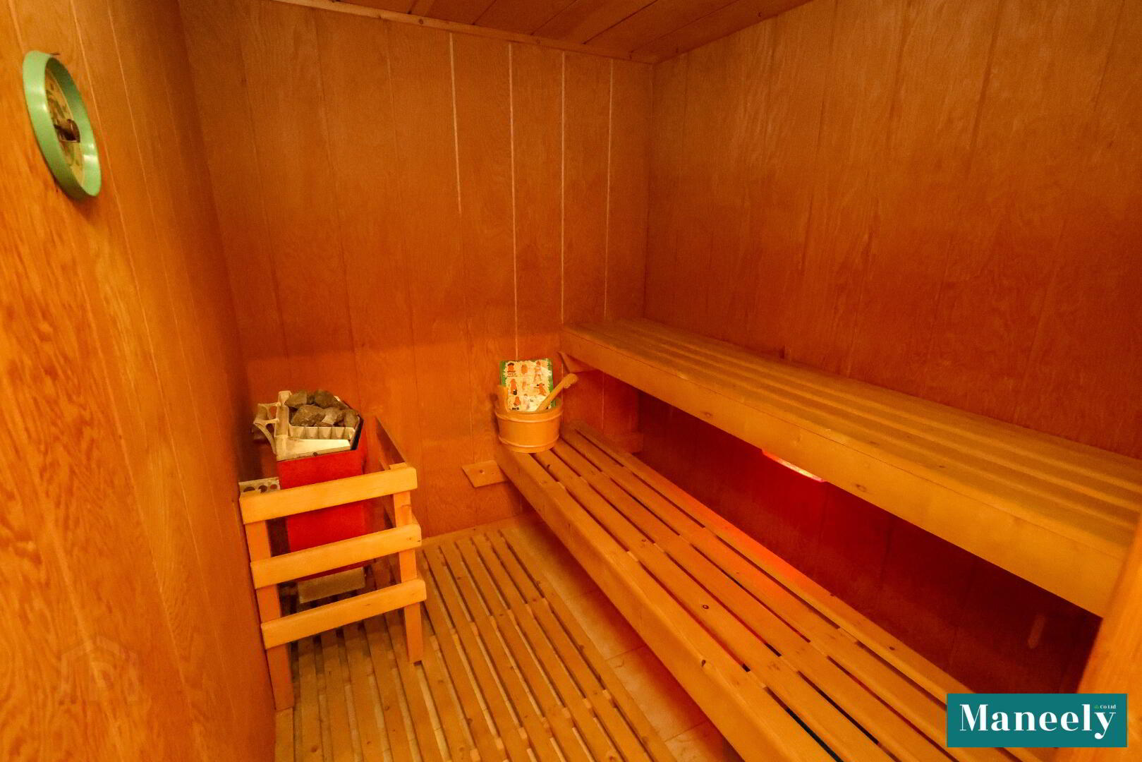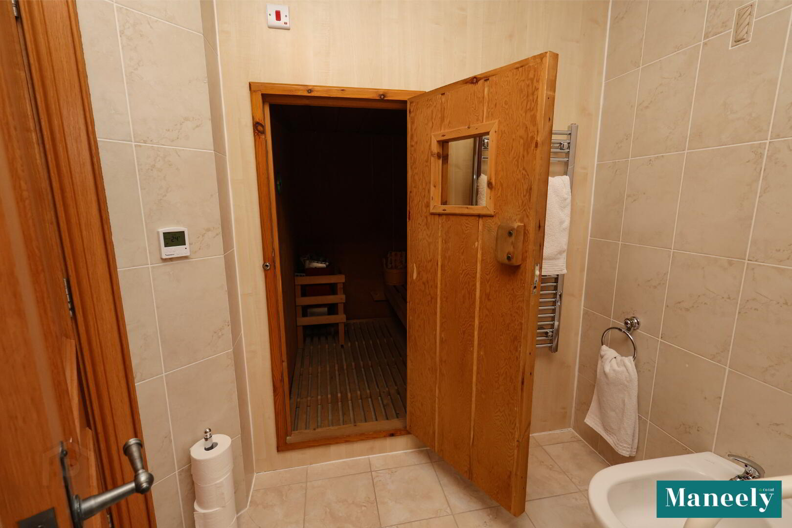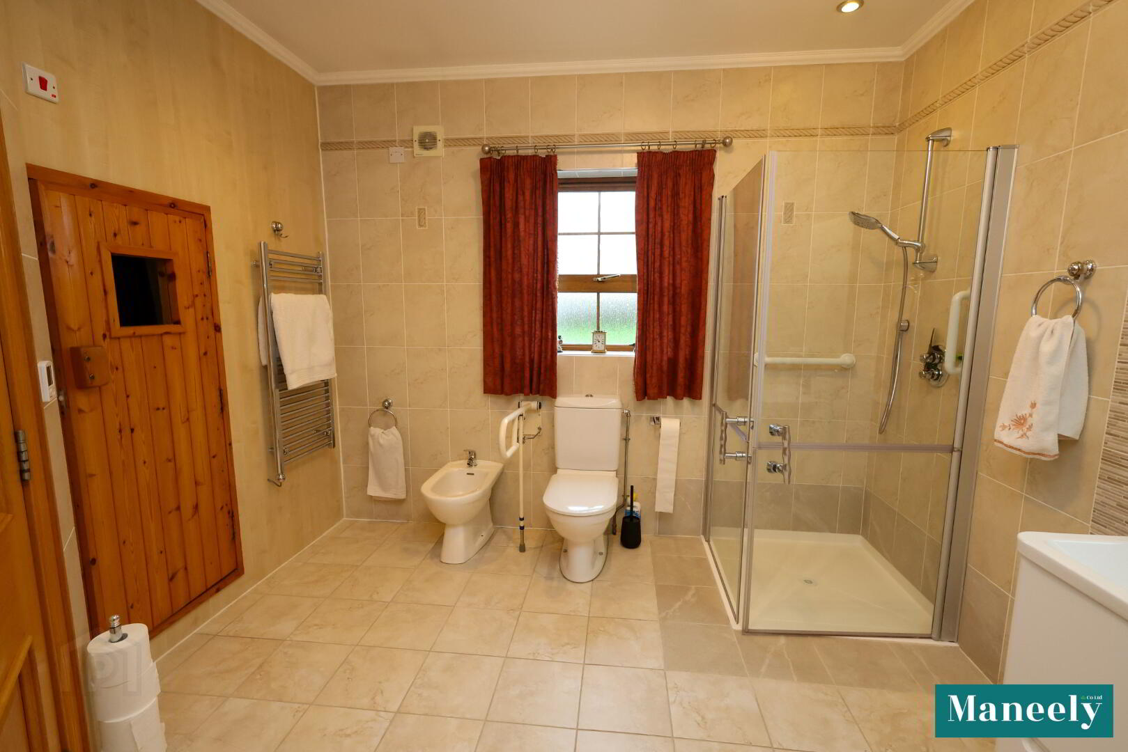 Luxury en suite featuring jacuzzi bath, close-coupled WC, vanity wash hand basin, bidet, corner shower, heated towel rail, tiled flooring, recessed spot lighting and a private sauna with wooden panelling, bench seating and electric heater.