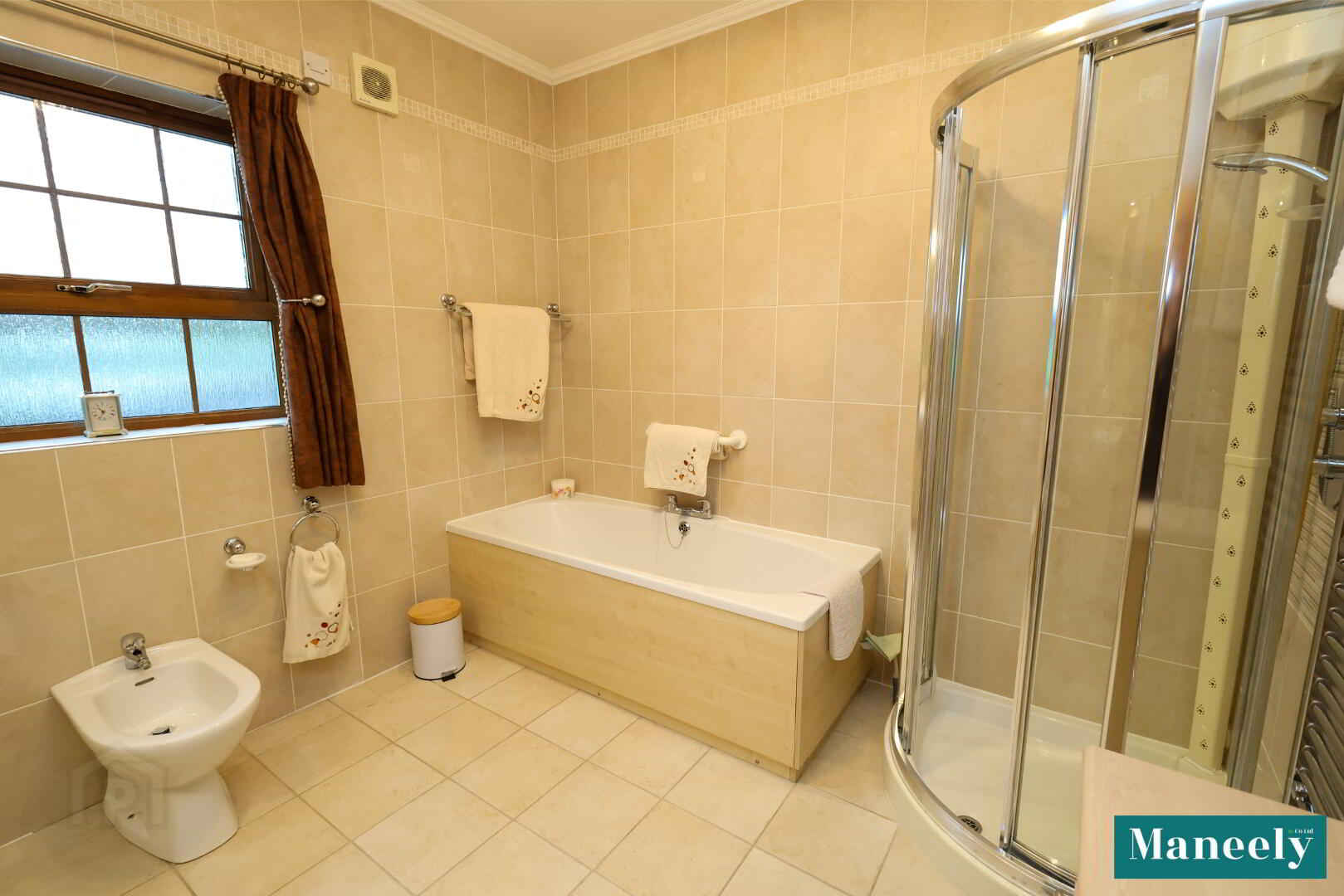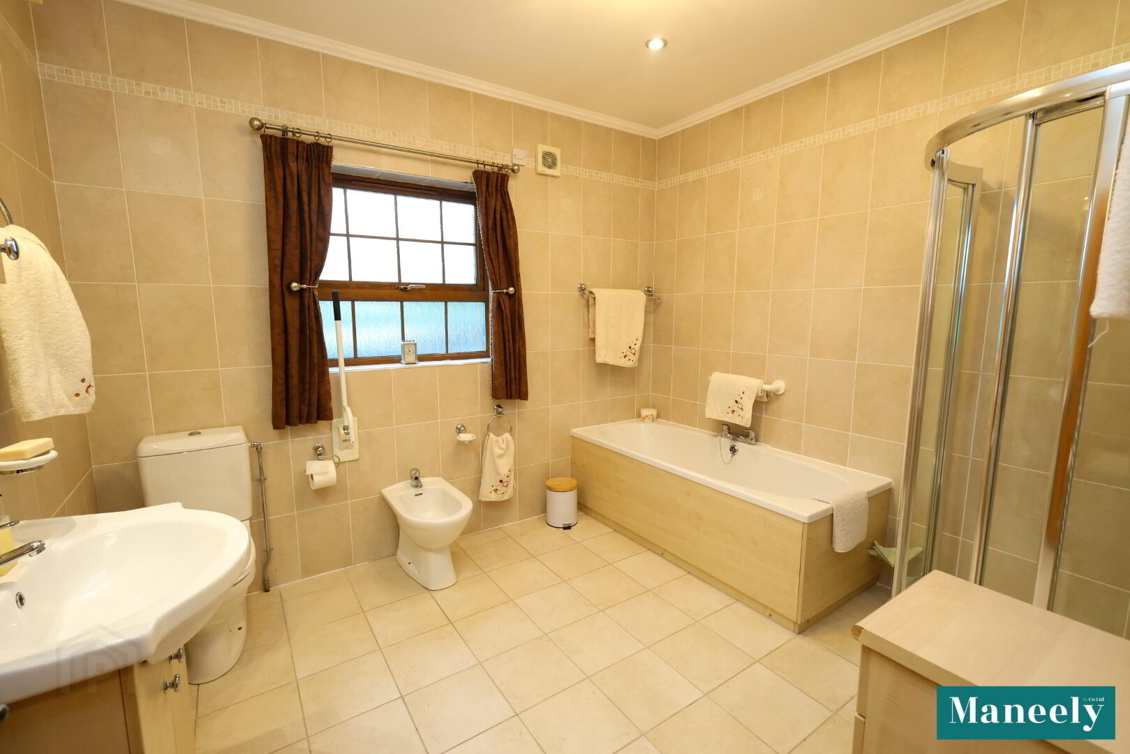 Panelled bath, corner shower, close-coupled WC, pedestal wash hand basin, bidet, wall tiling, tiled flooring and recessed spot lighting.
