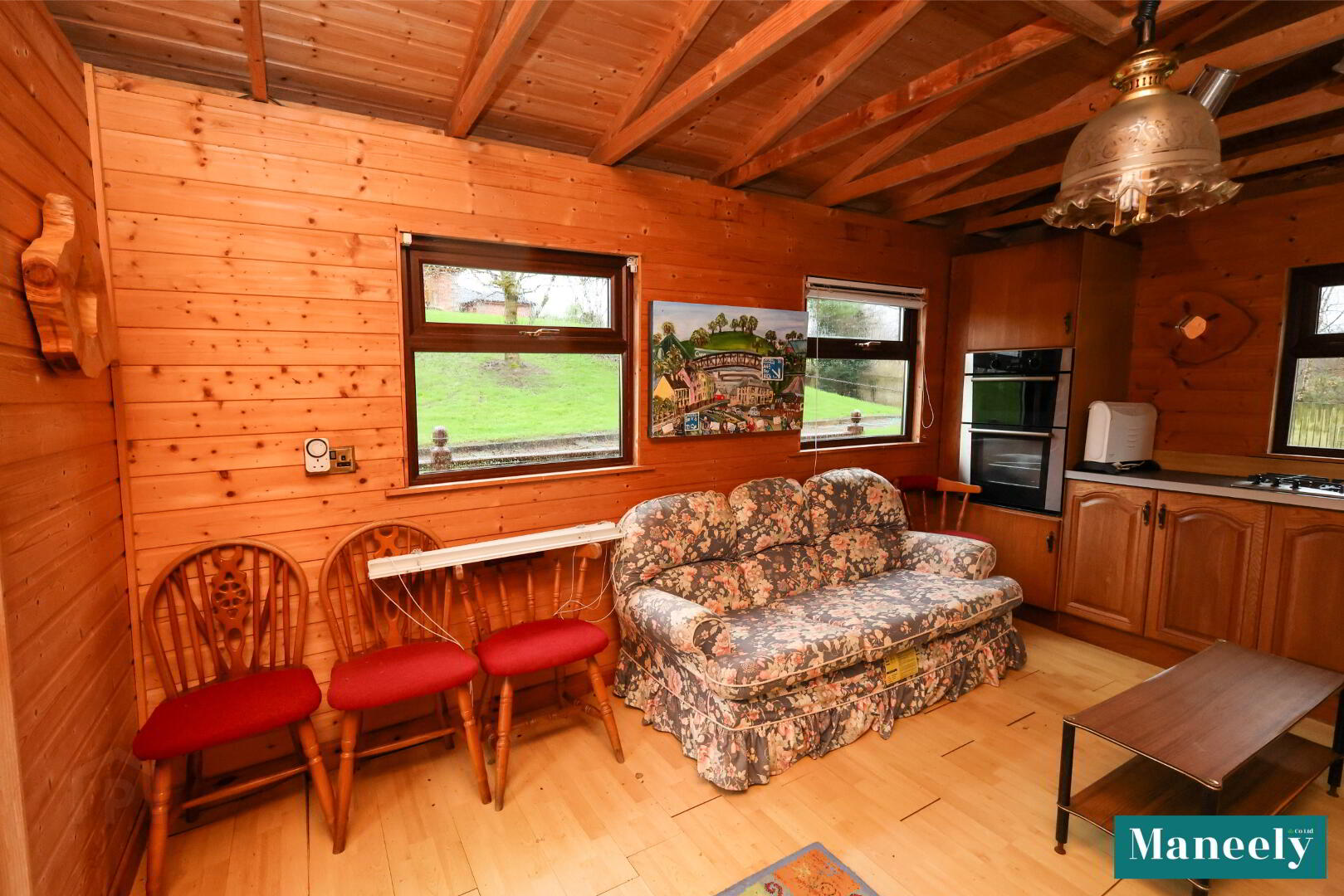 Fitted kitchen units with integrated fridge/freezer, gas hob, eye-level ovens, electric heating, tri-aspect windows with panoramic lake views, seating area, wooden wall panelling, glazed PVC front door, decking surrounding