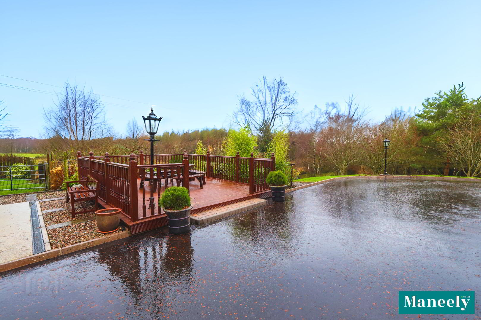- Raised wooden decking area with outdoor seating