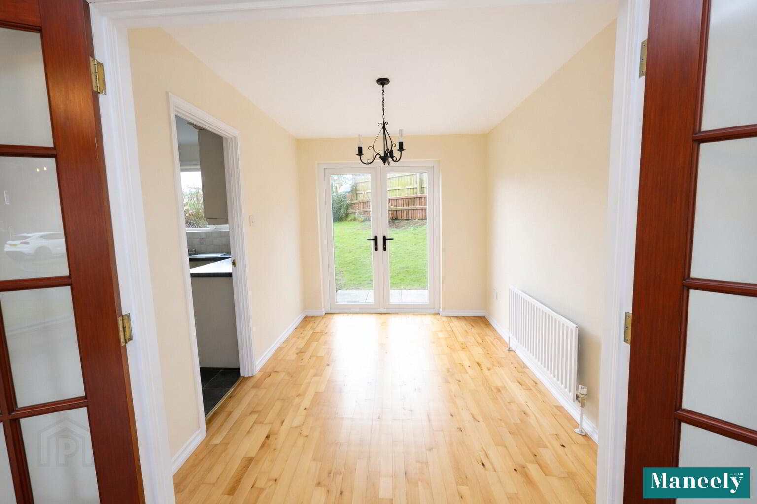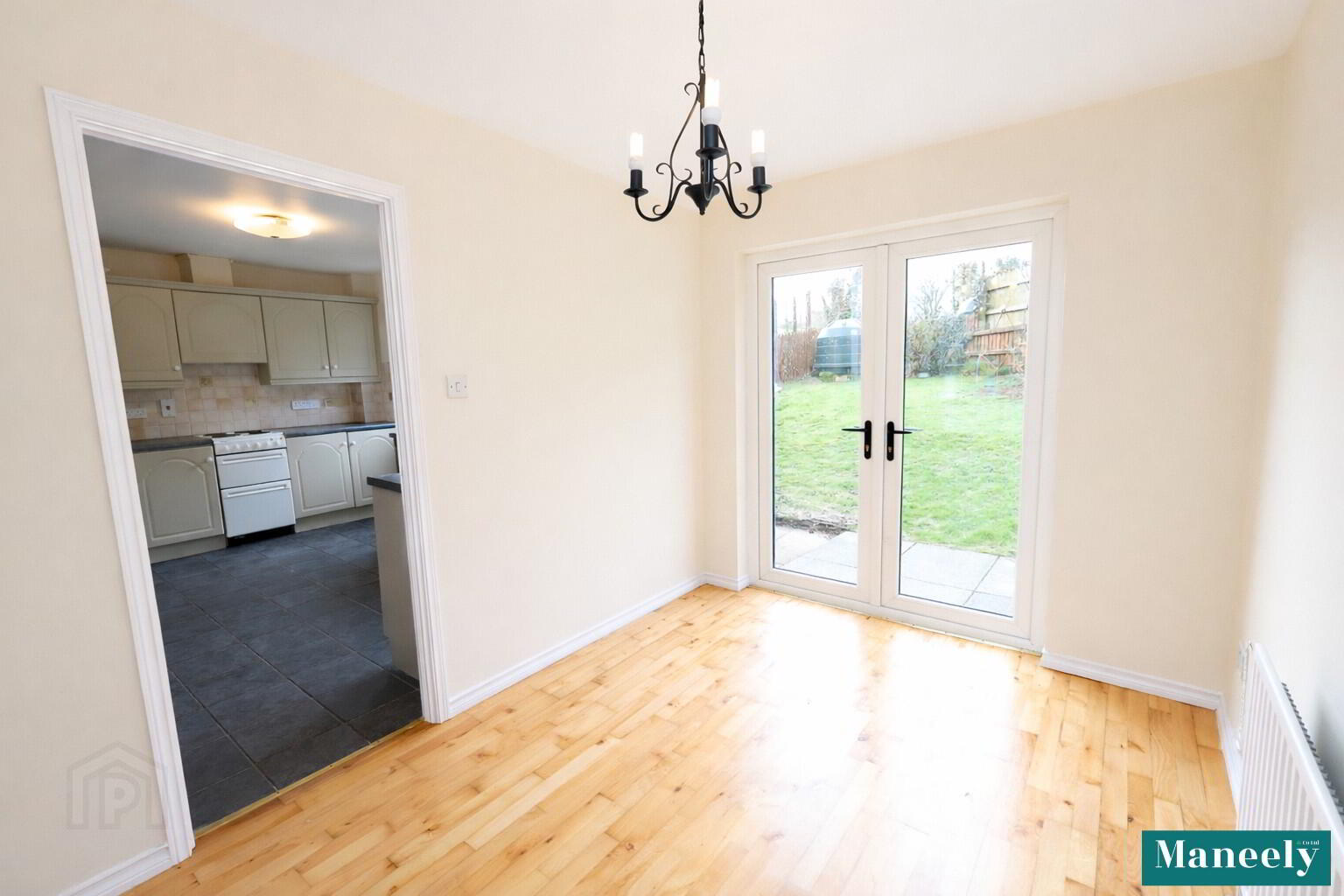A well-proportioned dining area finished with wooden flooring and benefiting from PVC doors leading directly to the rear garden, allowing for excellent indoor-outdoor flow. Power points.