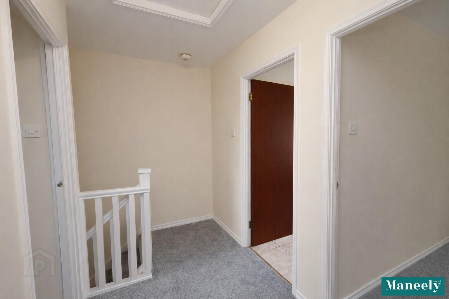 Carpeted landing with access to a shelved hot press.