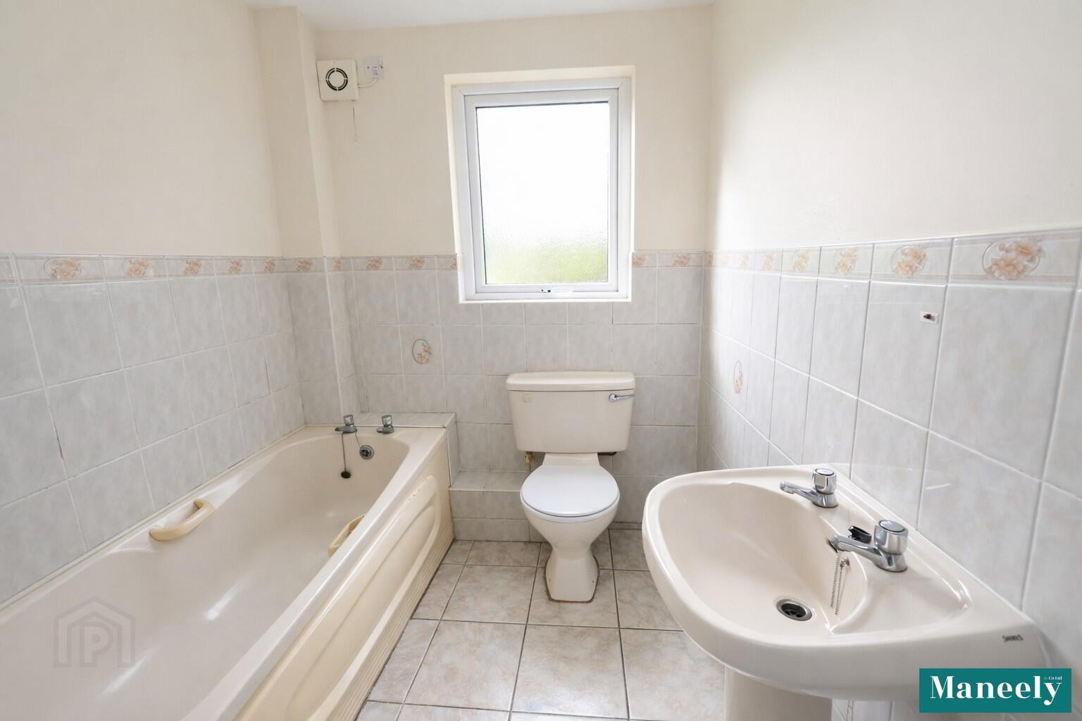 Comprising a low-flush WC, pedestal wash hand basin, panelled bath, and separate corner shower with tiled surround and glass enclosure. Finished with tiled flooring, half-wall tiling, and extractor fan.