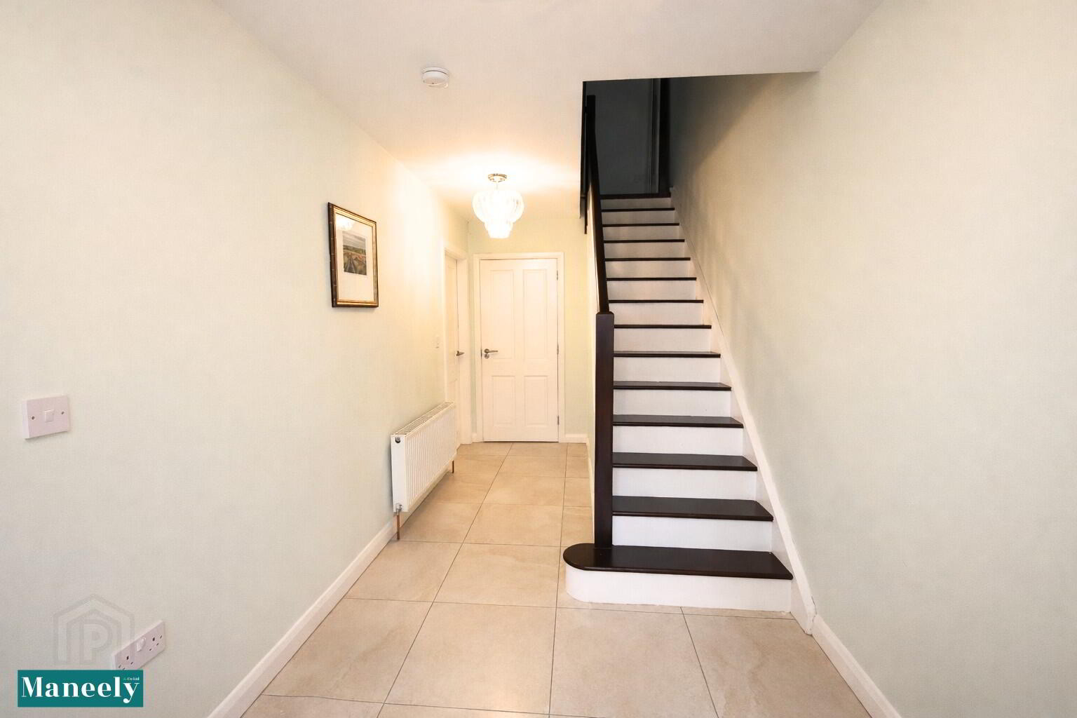 A welcoming and spacious hallway accessed via a stylish PVC front door. Finished with tiled flooring and featuring a wooden staircase to the first floor, under-stair storage and power points.