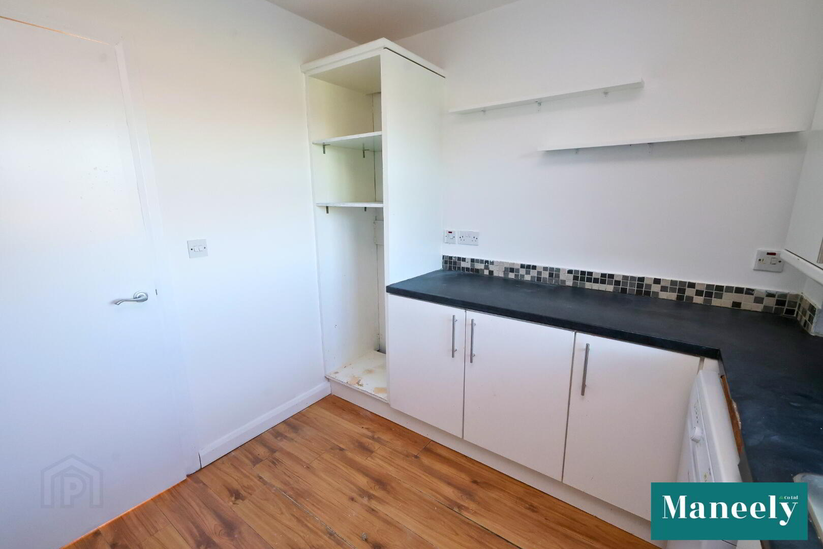 Fitted with a range of high and low level units, single bowl stainless steel sink unit, housing for cooker and hob with extractor fan, and space for a fridge. Finished with laminate flooring. Power points.