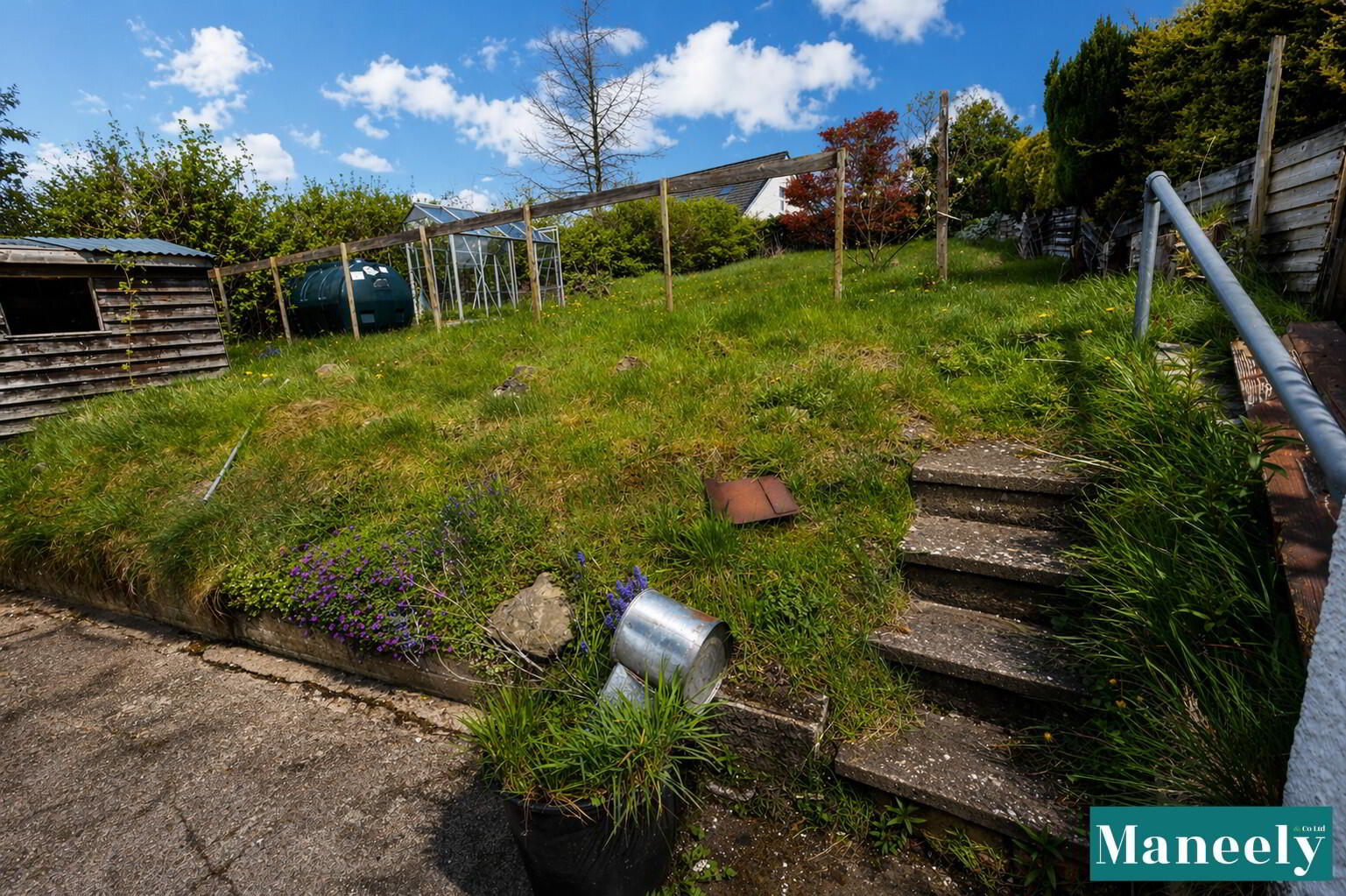 The fully enclosed rear garden and yard offer excellent outdoor space, complete with a garden shed, greenhouse, oil tank, and an integrated storage shed with power, housing the boiler.
