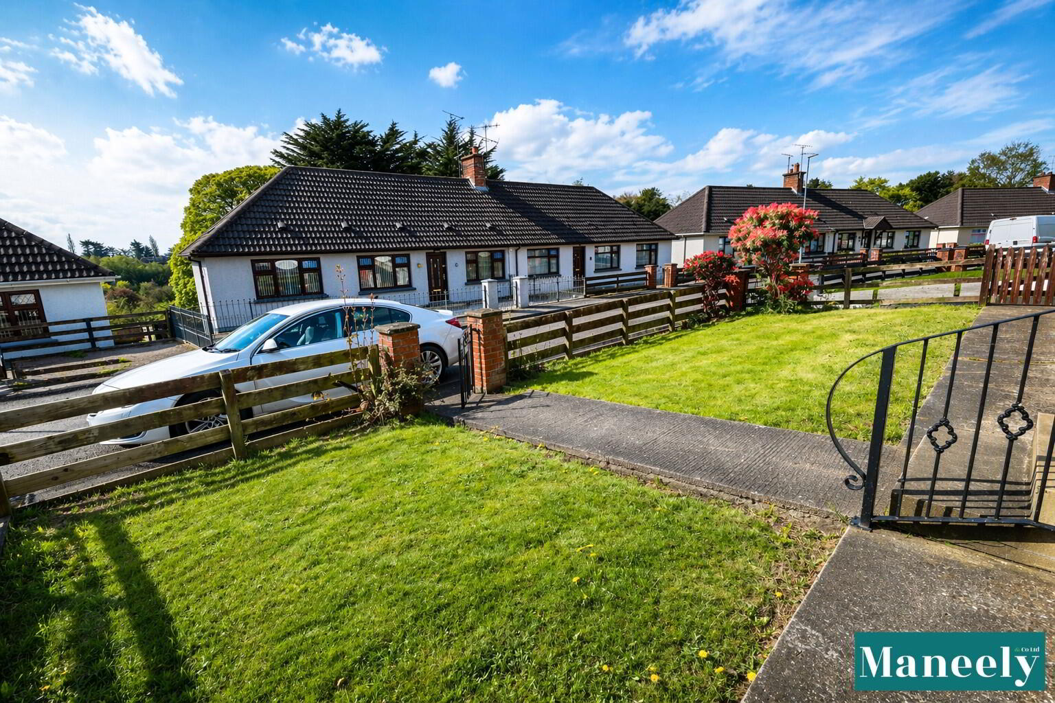 To the front, the property benefits from a neatly maintained lawn with fenced boundaries and a concrete driveway providing off-street parking.