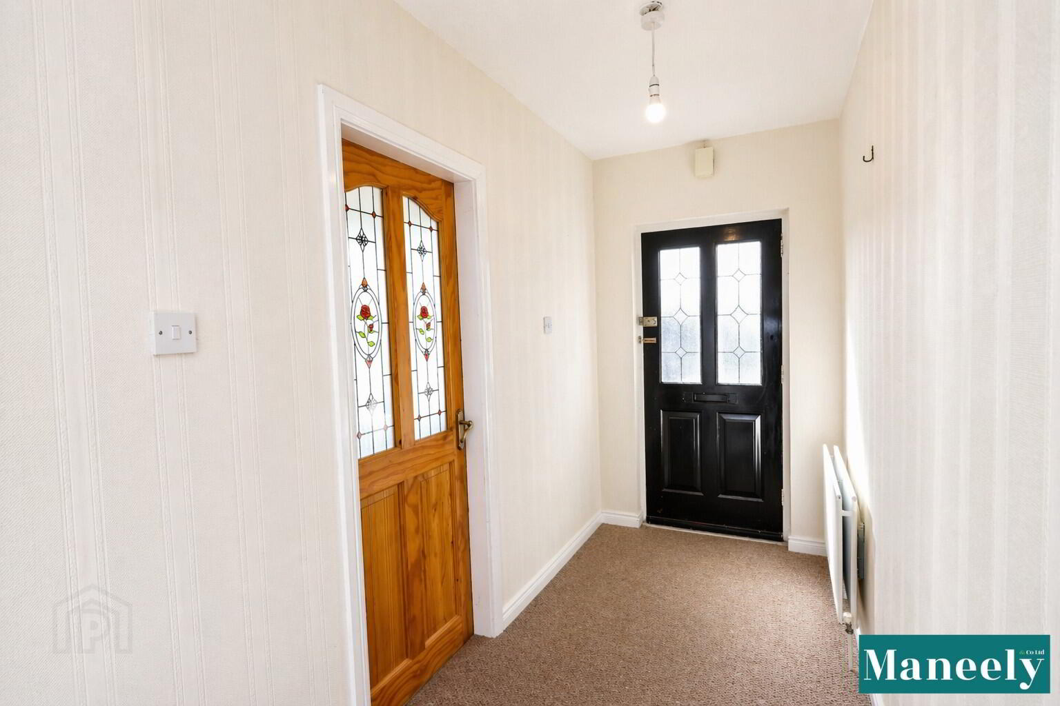 Accessed via a wooden front door with decorative glass panels, the welcoming entrance hall is spacious and finished with carpet flooring, complete with convenient internet access points.