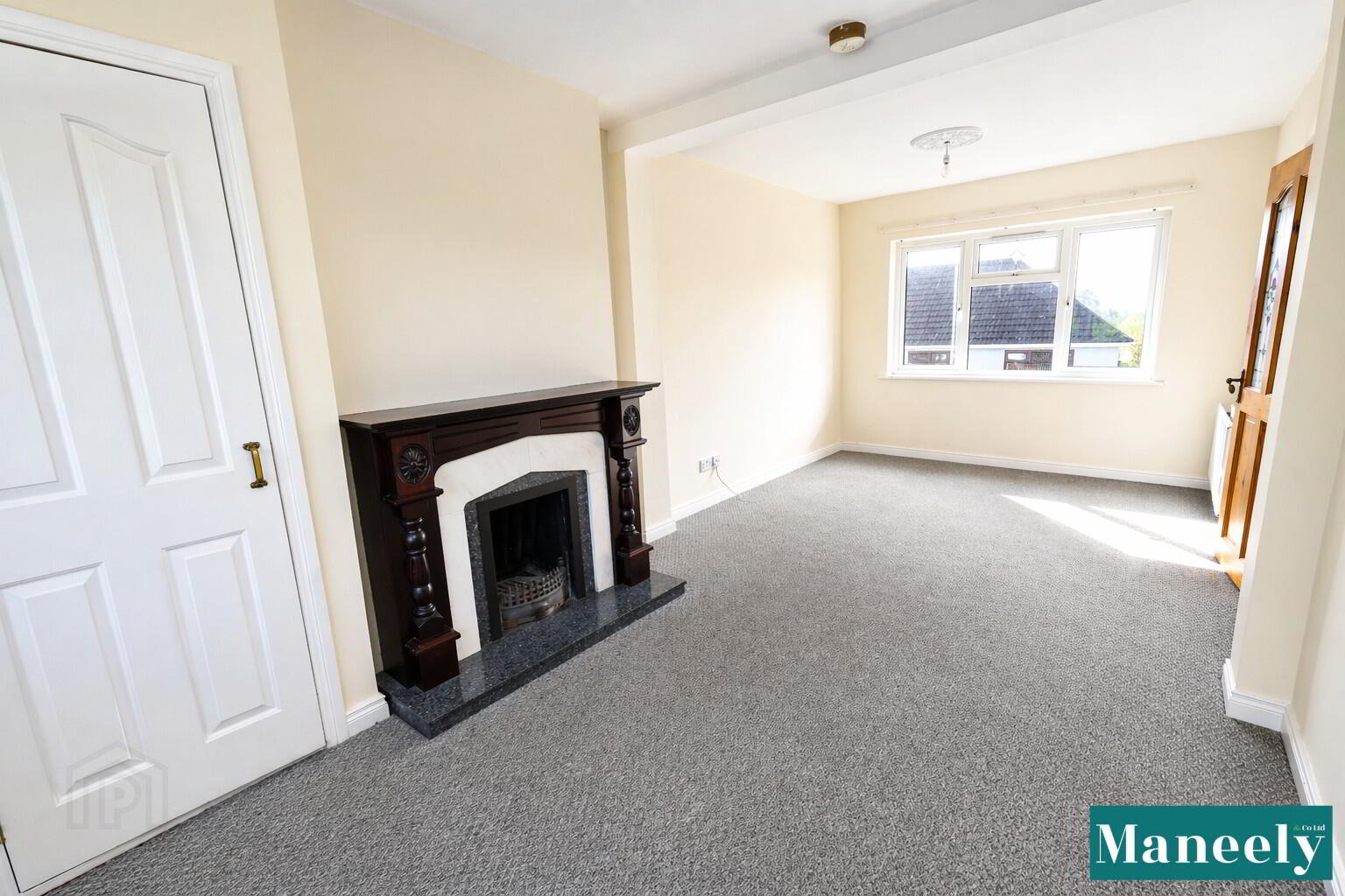 A spacious and inviting reception room featuring carpet flooring, TV and power points, and a shelved hot press. The room is centred around an eye-catching open fireplace with marble surround, wooden mantle, and tiled hearth.