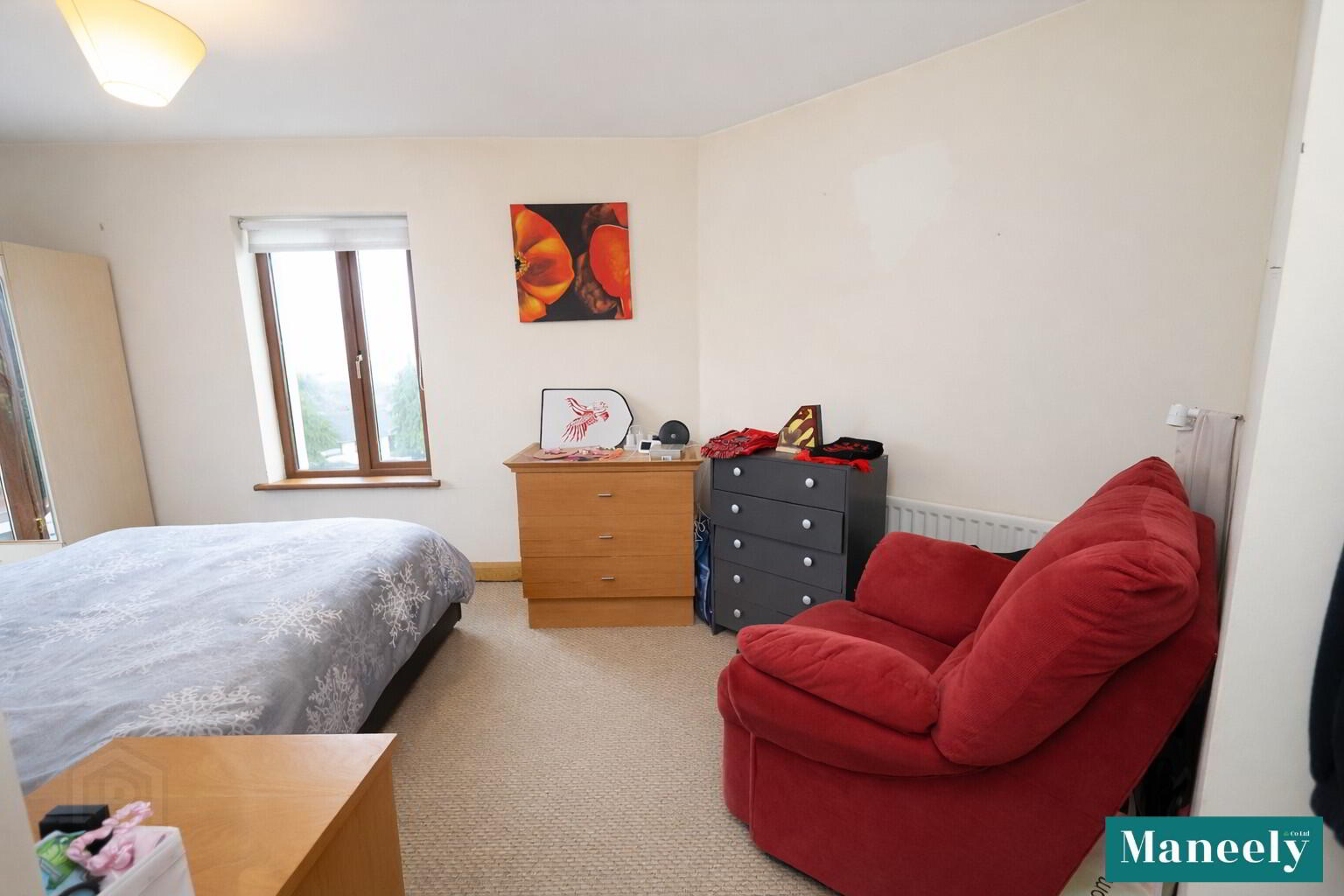 Well-proportioned bedroom finished with carpet flooring. Power points.