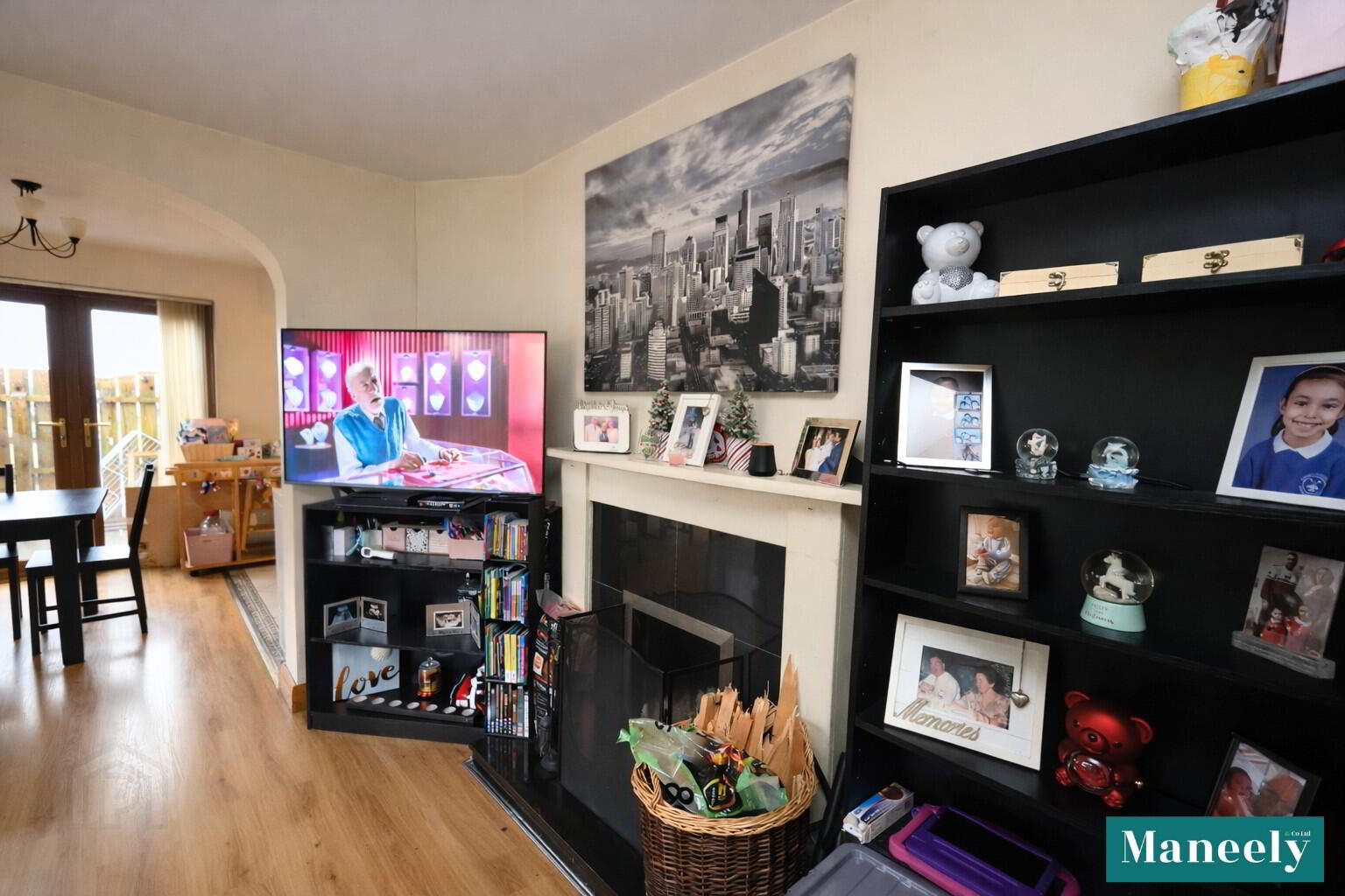 A bright front-facing reception room finished with laminate flooring and featuring an eye-catching open fire with tiled hearth. The space is open plan to the kitchen/dining area and benefits from TV and power points. French PVC doors lead to the enclosed side patio area.