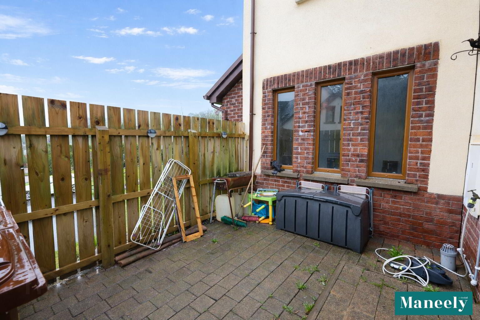 The property benefits from a spacious, enclosed side patio area with fencing, providing a private outdoor space ideal for relaxing or entertaining.