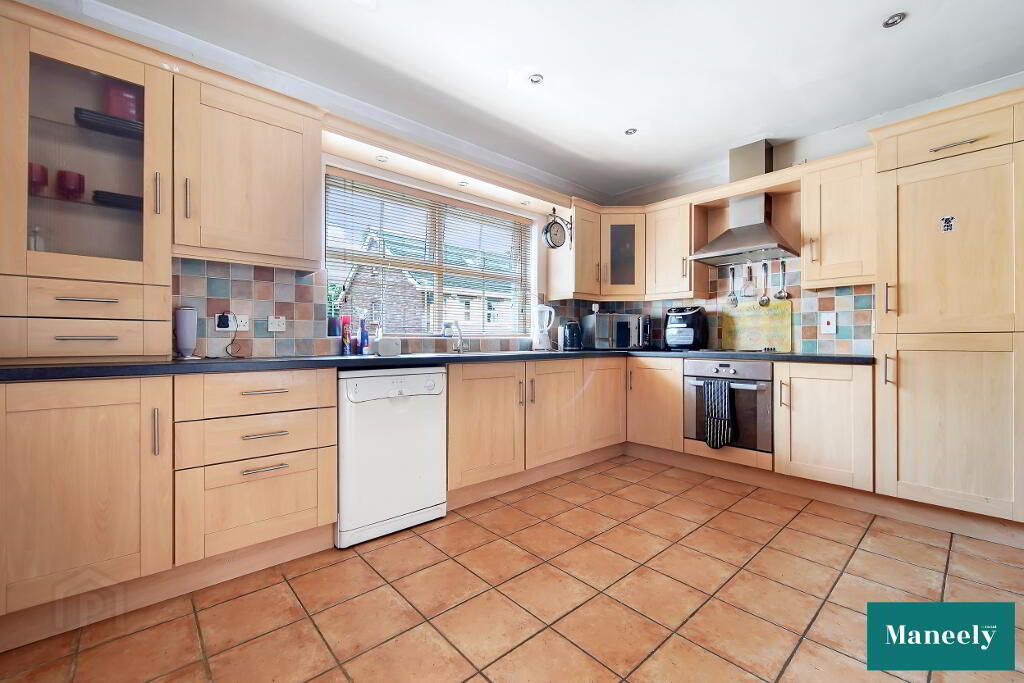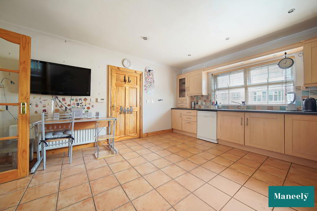 Spacious rear-aspect kitchen with an excellent range of high and low-level units, integrated oven, electric hob, extractor fan, and integrated fridge freezer. Space for dishwasher. Stainless steel sink with drainer, tiled flooring, partly tiled walls, and recessed spot lighting. Leads to WC and stairs to the lower ground floor.