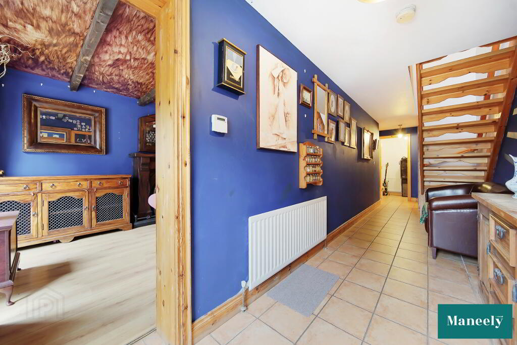Expansive hallway finished with tiled flooring, providing access to the rear patio, WC, storage room, utility, and second reception room. Power points.