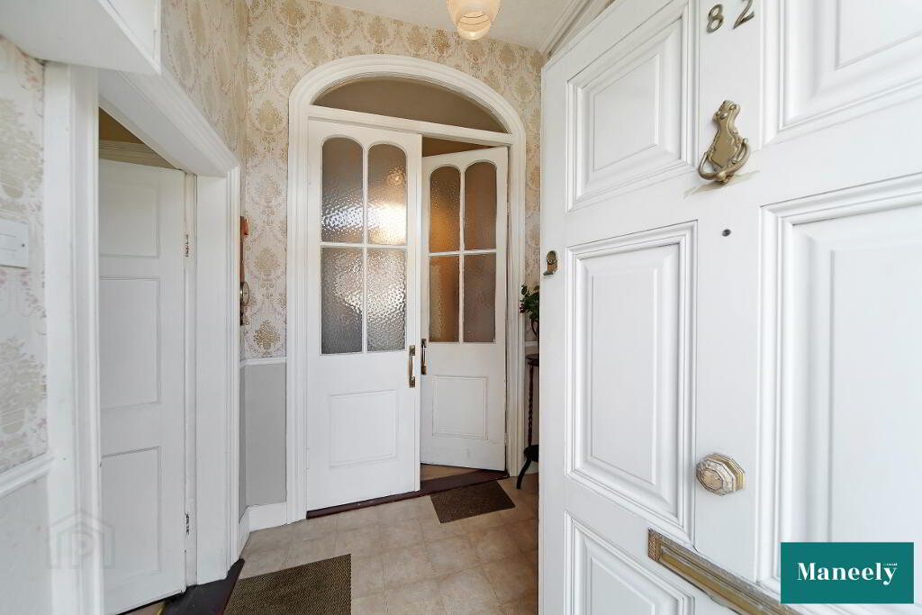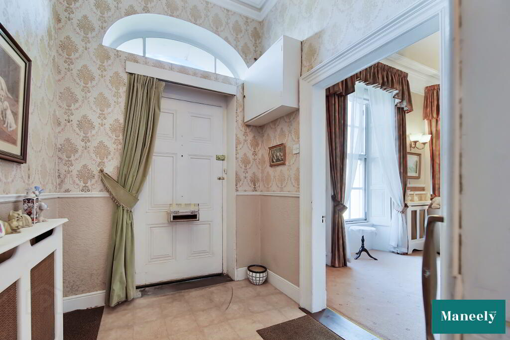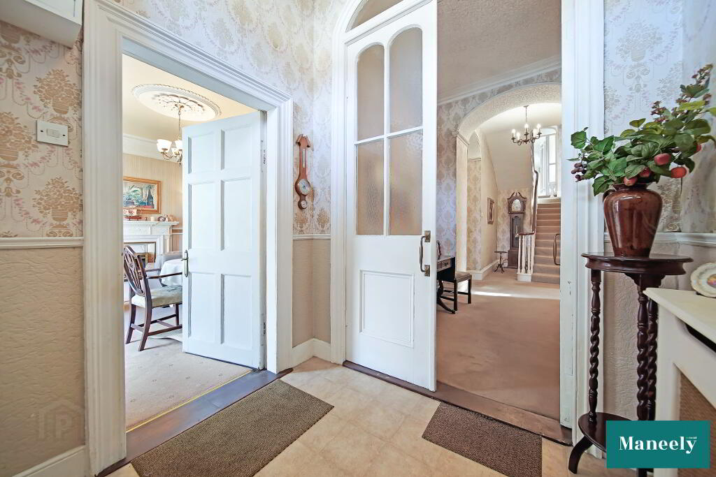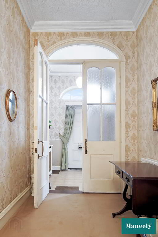 Entrance Hall: 2.47m x 2.16m Solid door with fan light. Dado rail. Moulded cornicing. French doors leading to inner hallway.