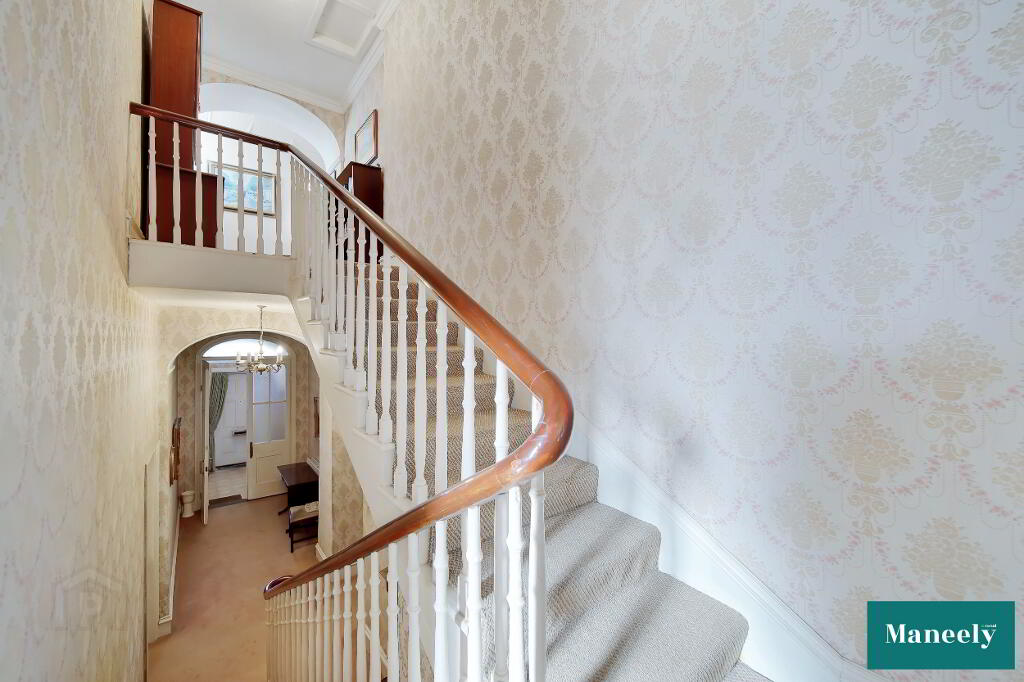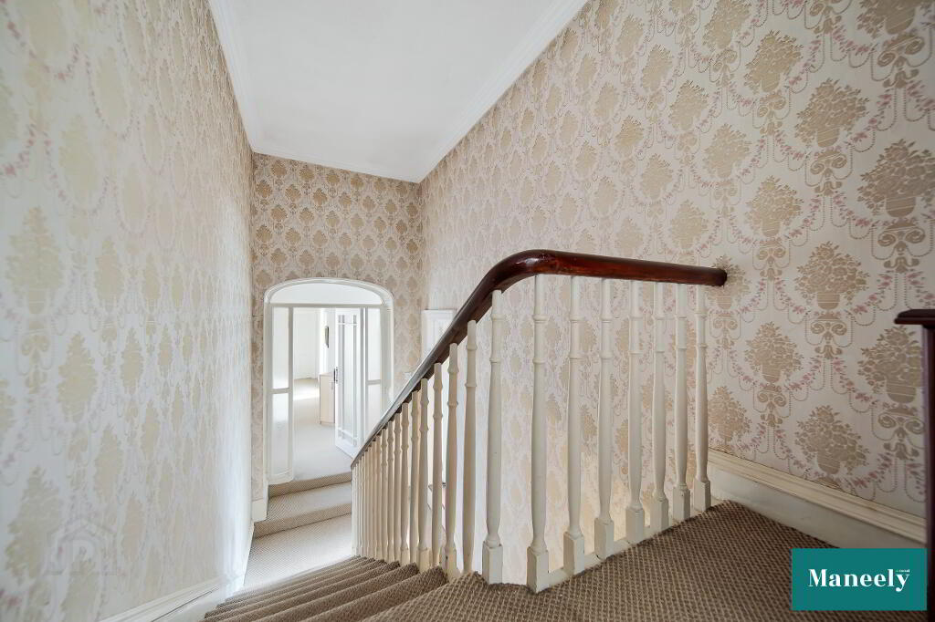 Inner Hallway: Feature balustrade staircase, carpeted. Moulded cornicing.