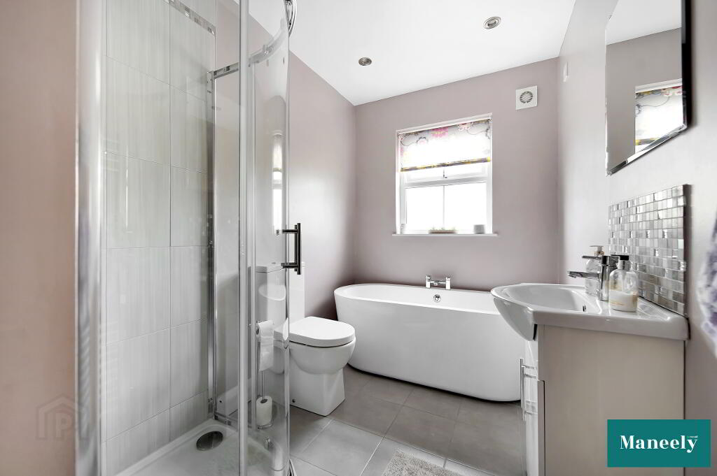 Tastefully finished with a modern suite including a two-flush WC, panelled bath, vanity unit with wash hand basin and mixer tap, and a separate corner shower with tiled surround and glass enclosure. Chrome towel radiator, spot lighting, and extractor fan.