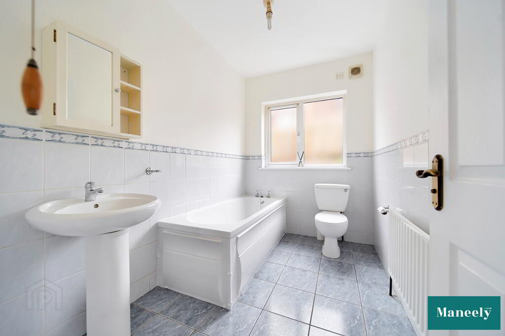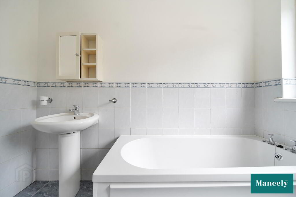 Comprising a panelled bath, pedestal wash hand basin with mixer tap, low flush WC, and extractor fan. Tiled flooring with 1/2 wall tiling.