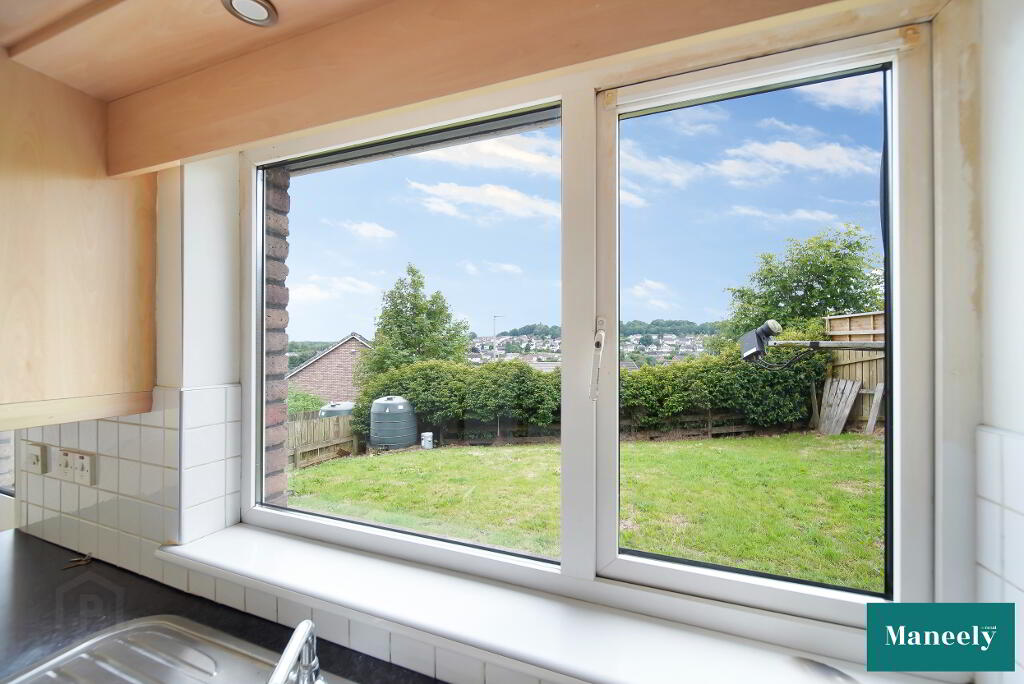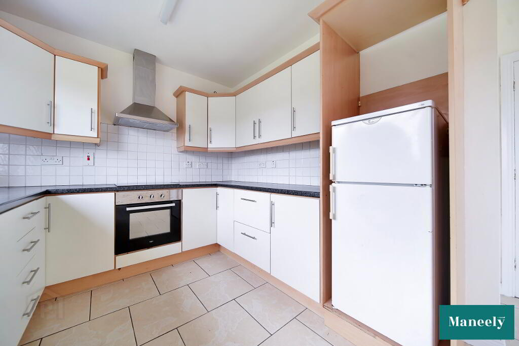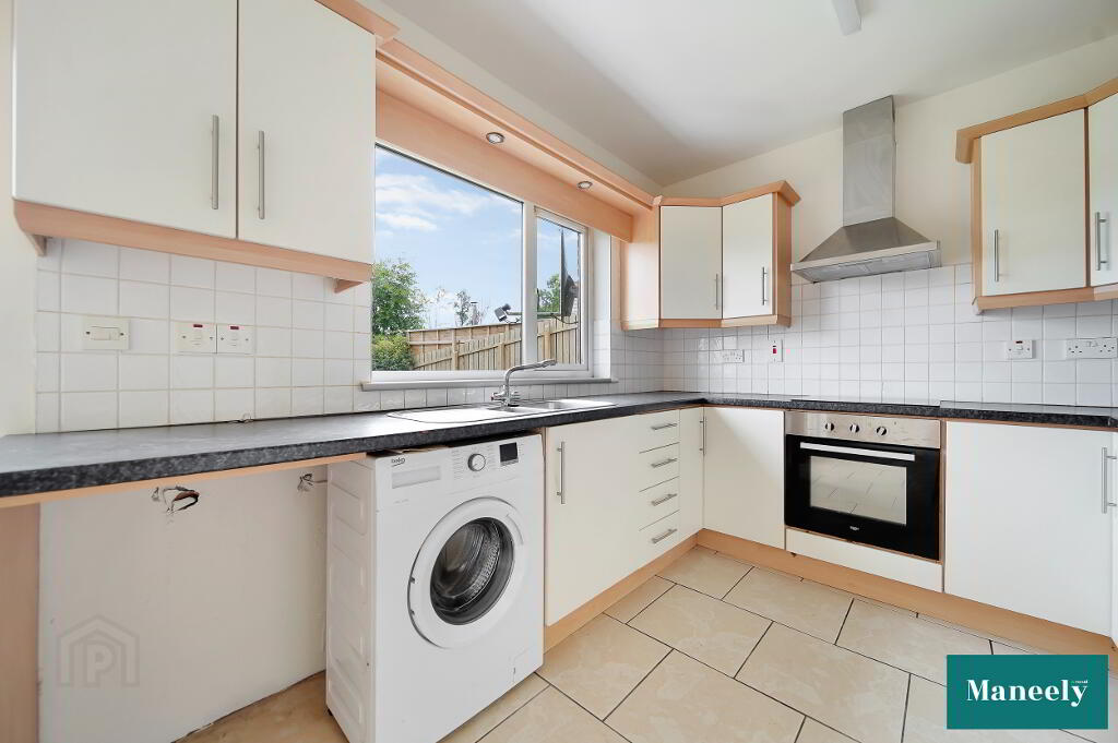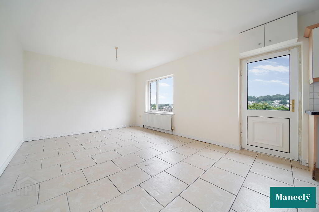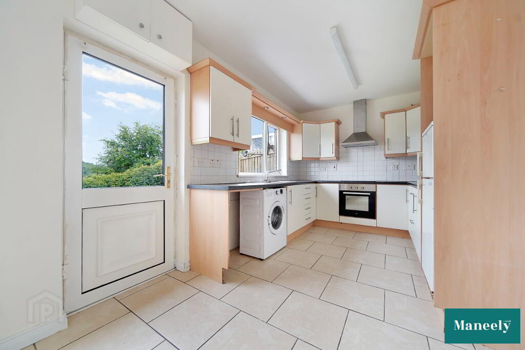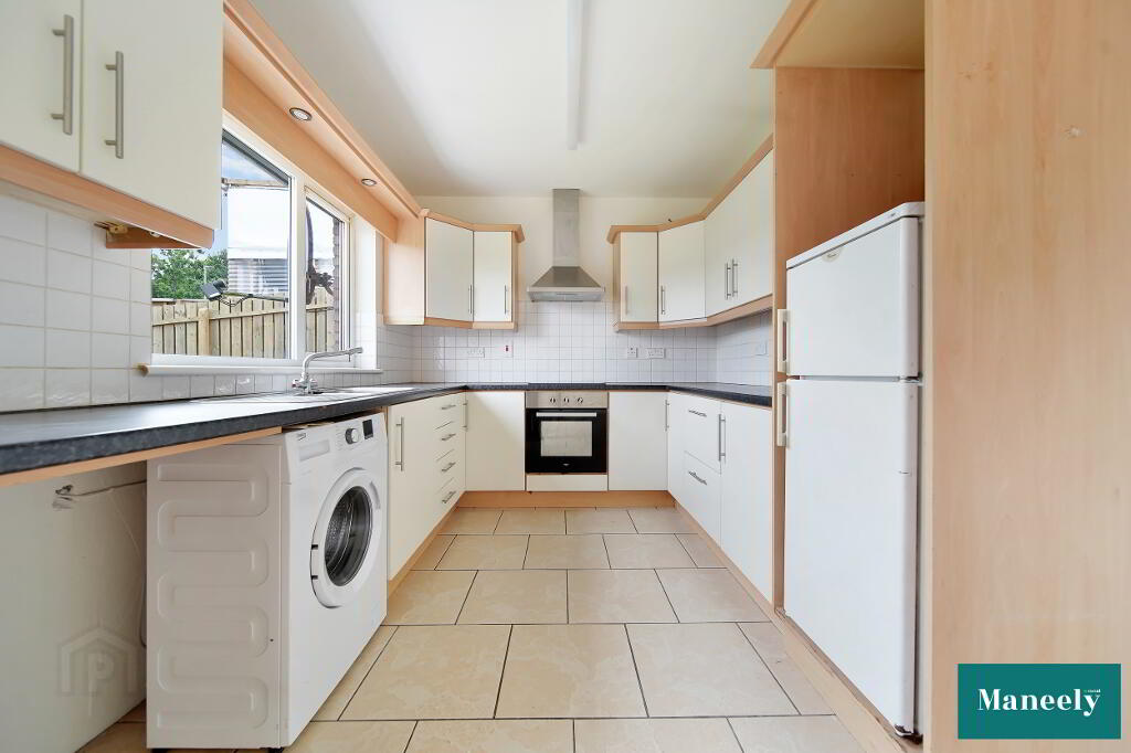 A generously sized kitchen/dining space, ideal for family living. Fitted with a range of high and low-level units, integrated oven with electric hob and extractor fan, stainless steel sink with drainer, and space for fridge freezer and auto washers. The area comfortably accommodates a dining suite. PVC door provides access to the rear garden.