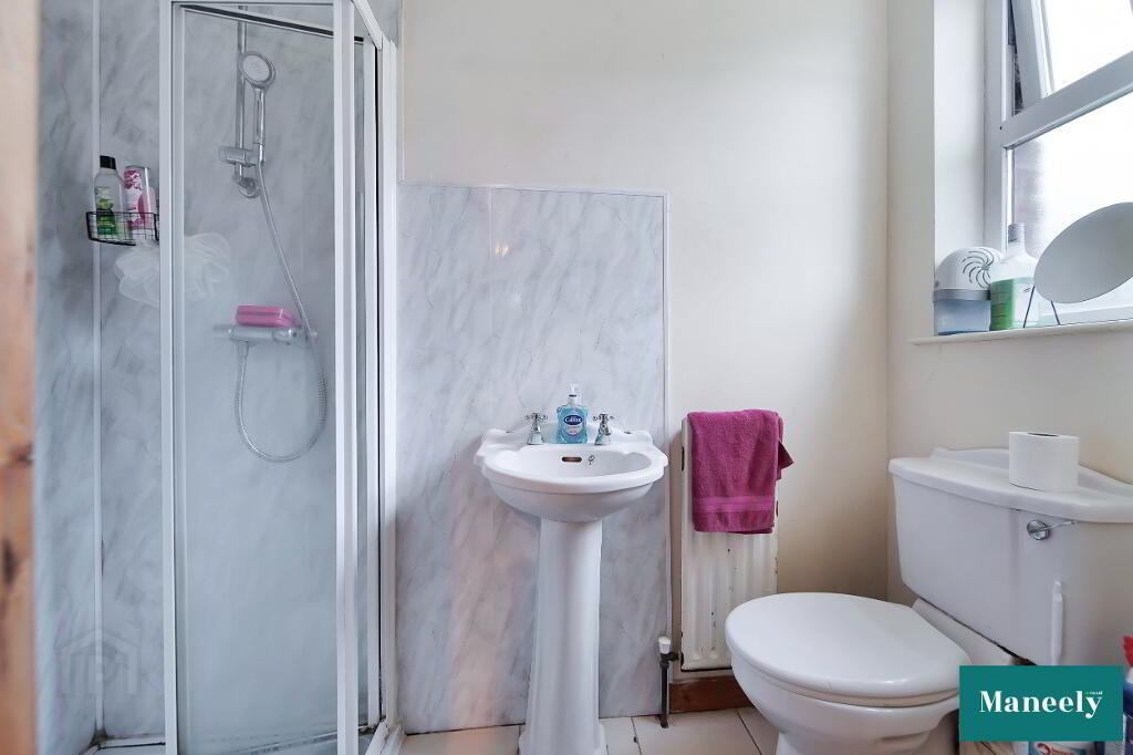 Comprising a pedestal wash hand basin, shower enclosure, and low flush WC. Fully tiled with extractor fan.