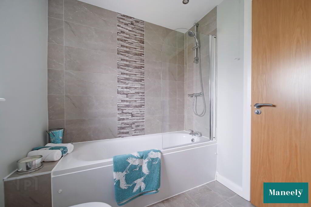 Bathroom suite comprising of a free standing vanity unit with wash hand basin & mixer tap, panelled bath with shower over, chrome towel radiator and two flush WC. Finished with tiled flooring and partly tiled walls around bath. Recess spot lightning.