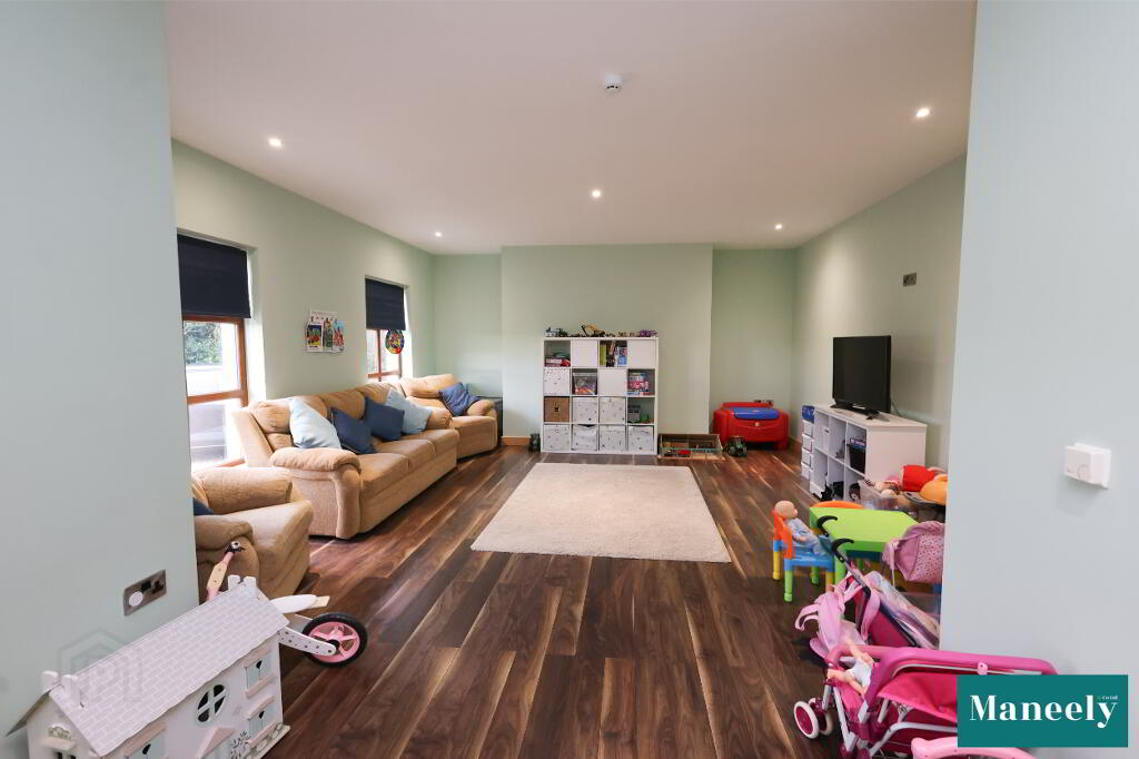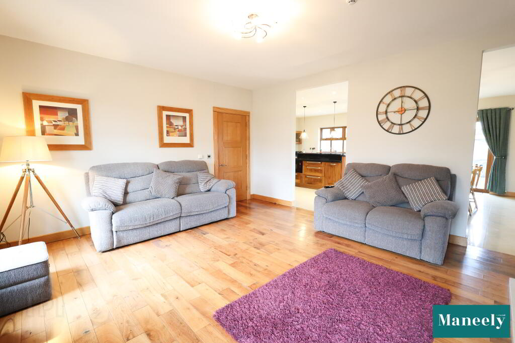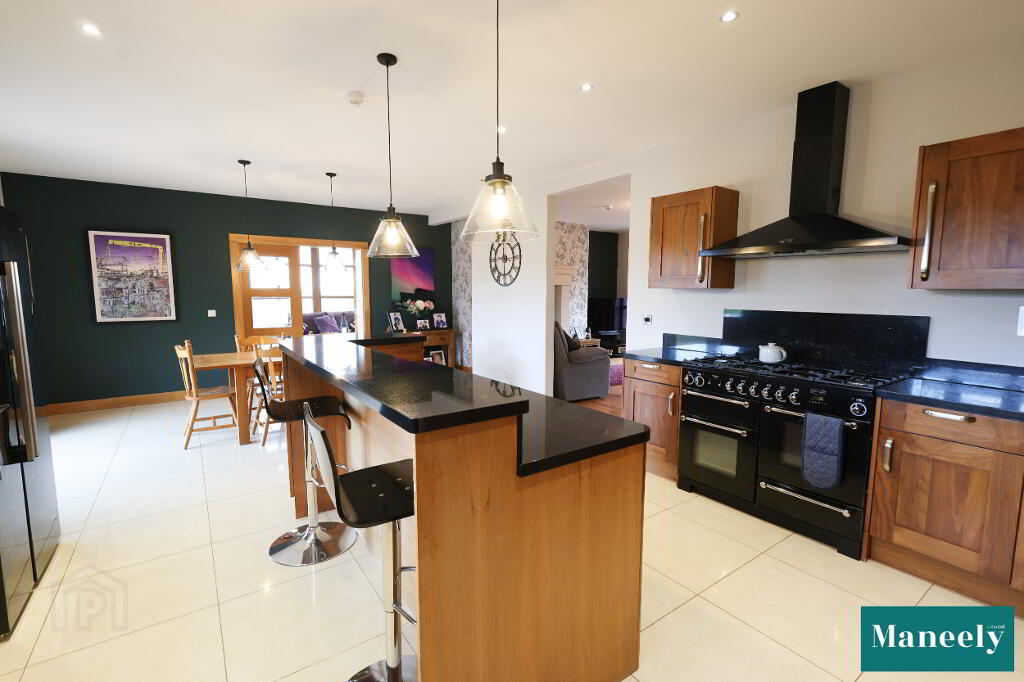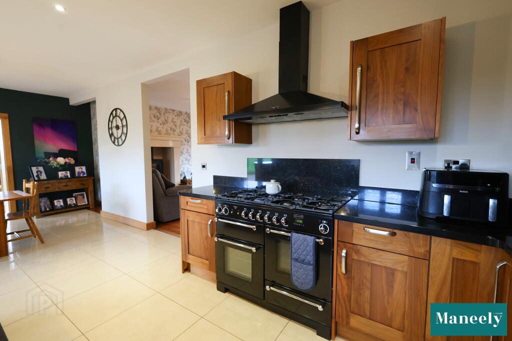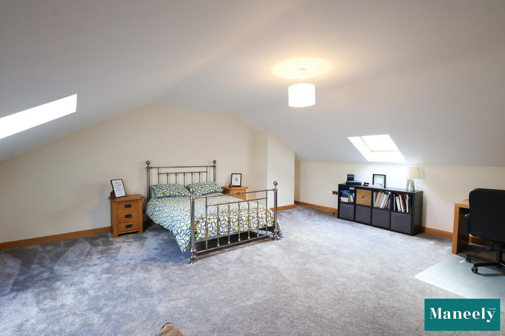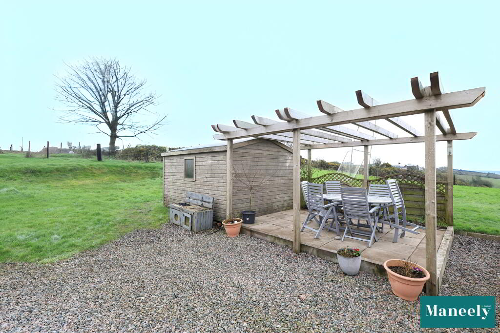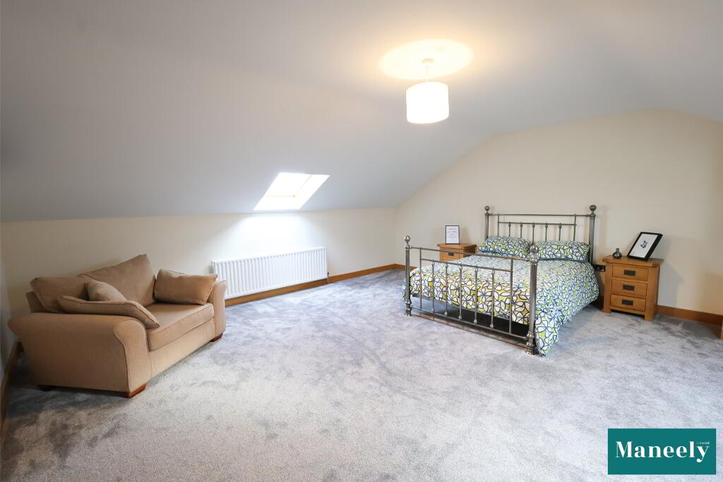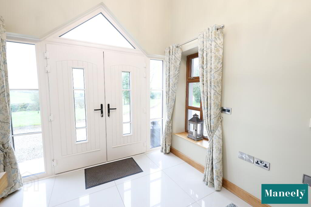 The property is accessed through a stoned entrance, providing ample off-street parking and an immediate sense of exclusivity. Set within beautifully maintained grounds, this impressive detached residence enjoys a prime rural position with uninterrupted views across the surrounding countryside.
