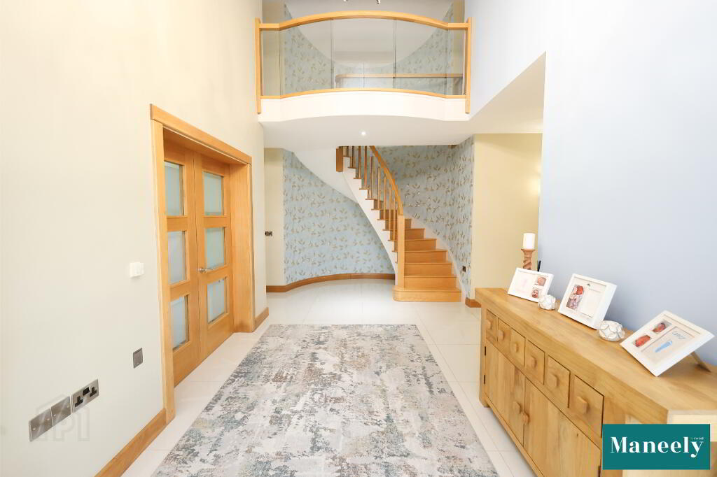 Accessed via PVC double doors with glass side panels, the impressive entrance hall immediately sets the tone for the property. Finished with tiled flooring, it features a striking spiral wooden staircase with a glass balustrade and feature landing. Power points throughout. Cloakroom off (2.03m x 2.17m), finished with matching tiled flooring.
