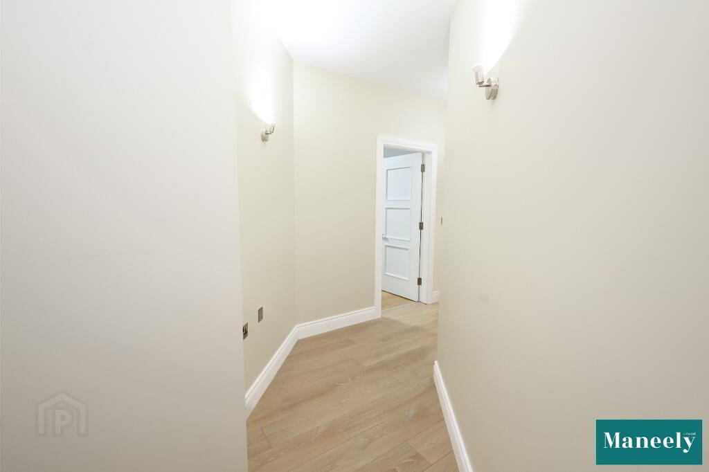 Finished with laminate flooring. Power points. Shelved hot press located off.