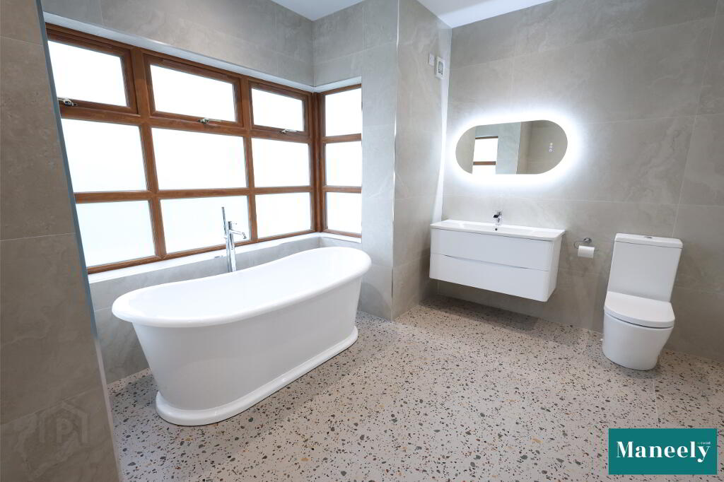 Tastefully finished family bathroom featuring dual-flush WC, vanity unit with wash hand basin and mixer tap, ceramic bath, walk-in shower, chrome towel radiator, extractor fan, and recessed spot lighting. Fully tiled walls and floor.