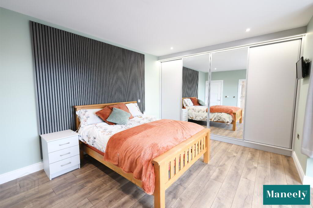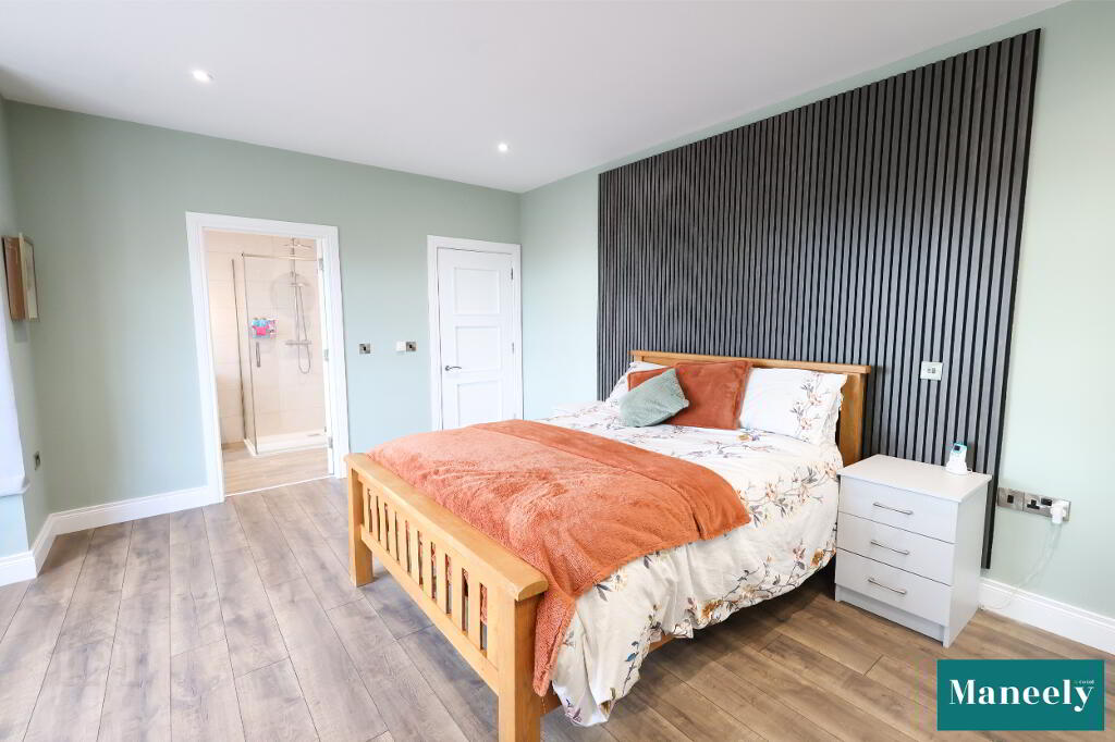Impressive rear-facing master bedroom featuring laminate flooring, recessed spot lighting, and a feature panelled wall. Enjoys excellent natural light via a box window. Power points and TV point. En-suite off.