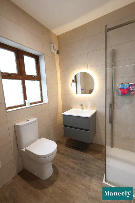 Fully tiled en-suite comprising dual-flush WC, vanity unit with wash hand basin and mixer tap, corner shower with glass enclosure, extractor fan, and recessed spot lighting.