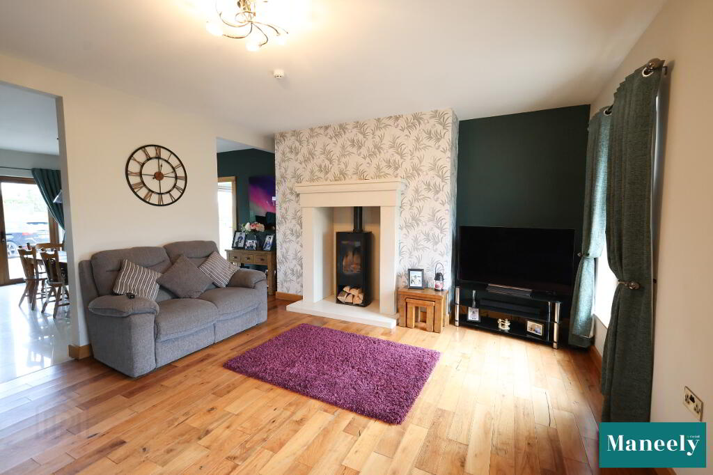 Front aspect reception room with wooden flooring, featuring an eye-catching multi-fuel stove with tiled hearth and granite surround. Includes power points and TV point. Open plan to the kitchen and dining area.