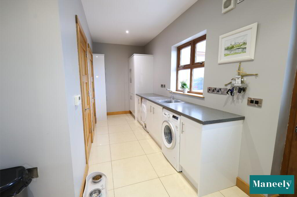 Spacious utility room plumbed for automatic washing appliances, with high and low units, stainless steel sink, recessed spot lighting, tiled flooring, and PVC door to the rear.