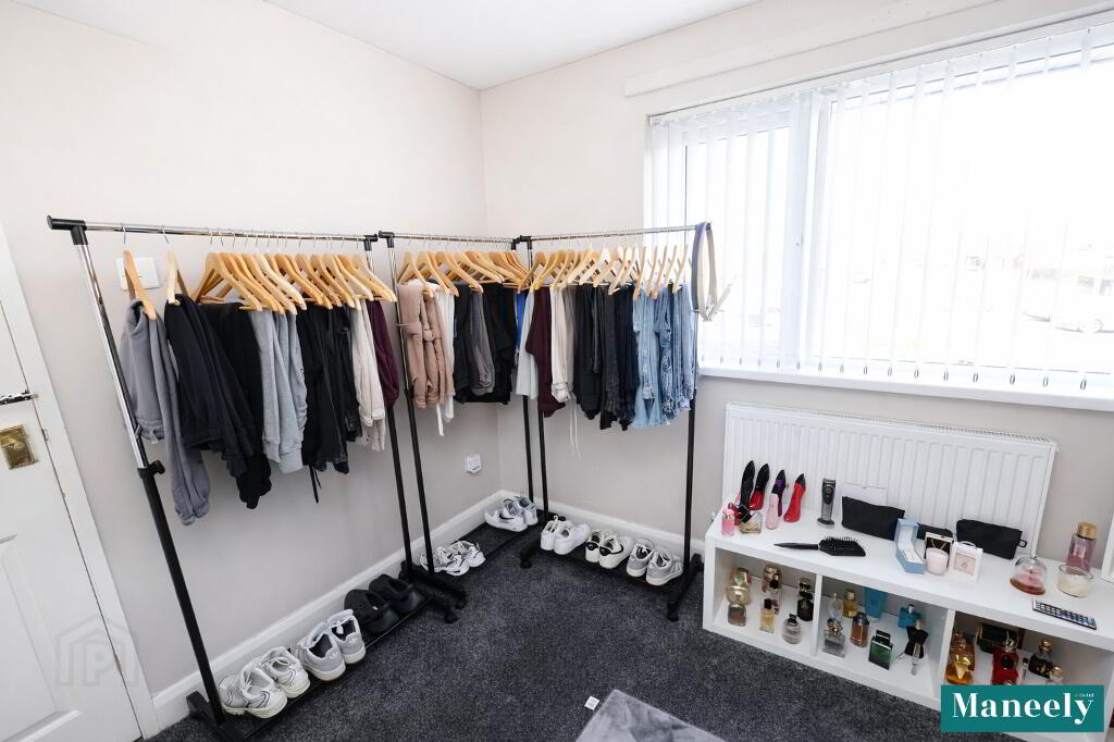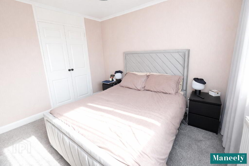 Generous front-aspect double bedroom with built-in storage and carpet flooring.