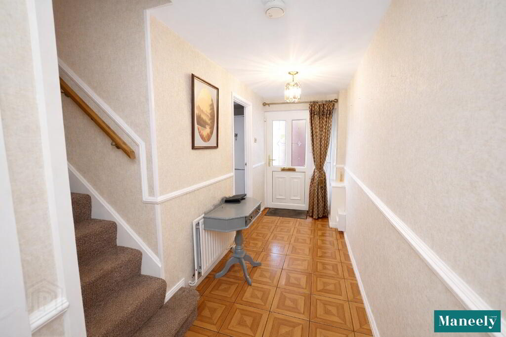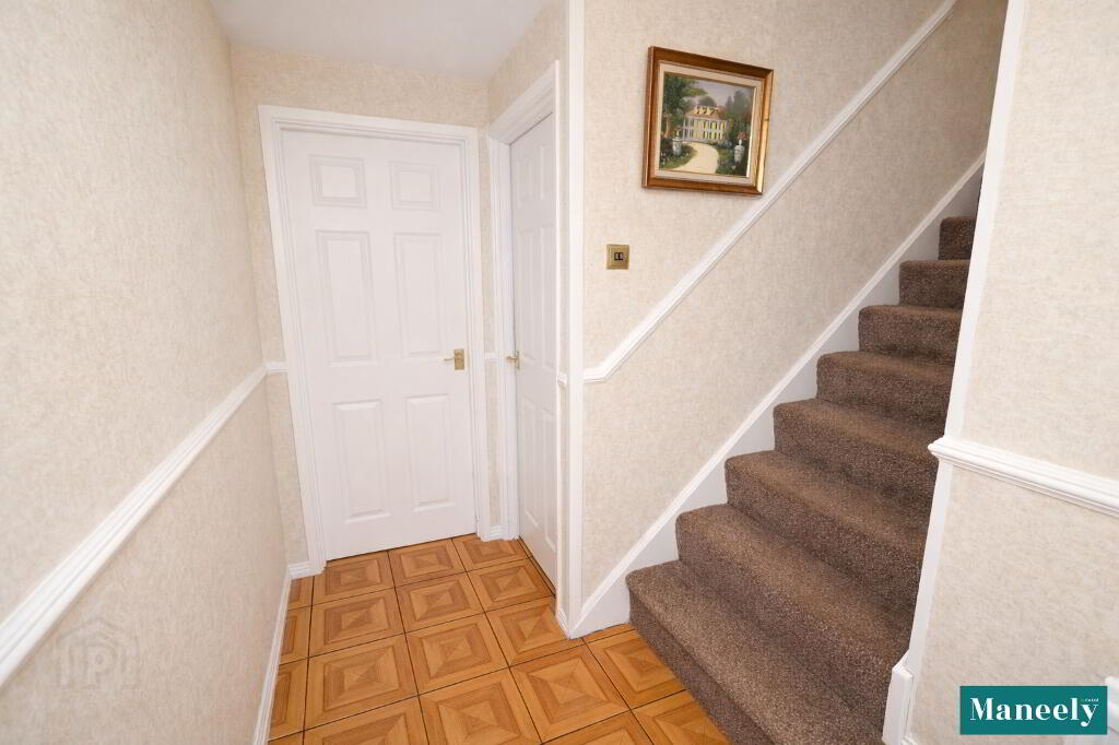 A welcoming entrance hall accessed via a stylish PVC front door, finished with tiled flooring and a carpeted staircase to the first floor.