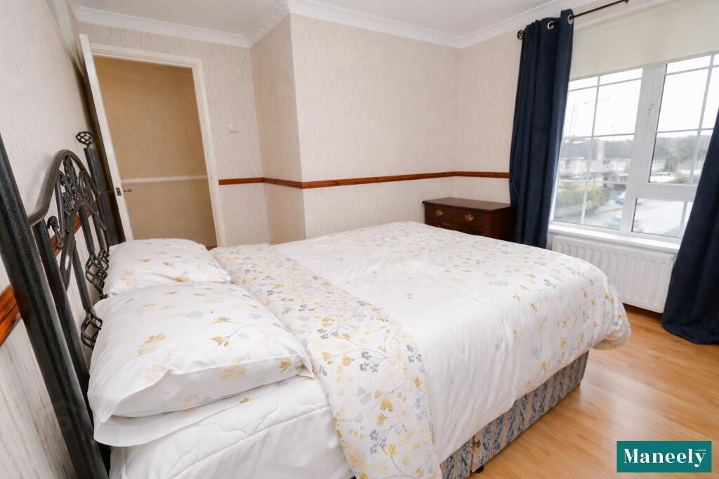 Generous front-aspect double bedroom with built-in storage, laminate flooring, power points and attractive ceiling coving.